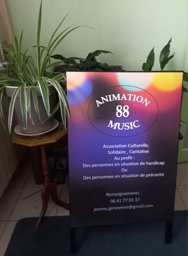 Créée le 14 décembre 2023 à Saint-Nabord, l’association Animation 88 Music, présidée par Geneviève Jeanny, propose des animations et spectacles musicaux dans une ambiance lumineuse et colorée. La spécificité de cette association réside dans son engagement social : une partie de ses bénéfices est reversée aux personnes en situation de handicap, en précarité ou âgées.