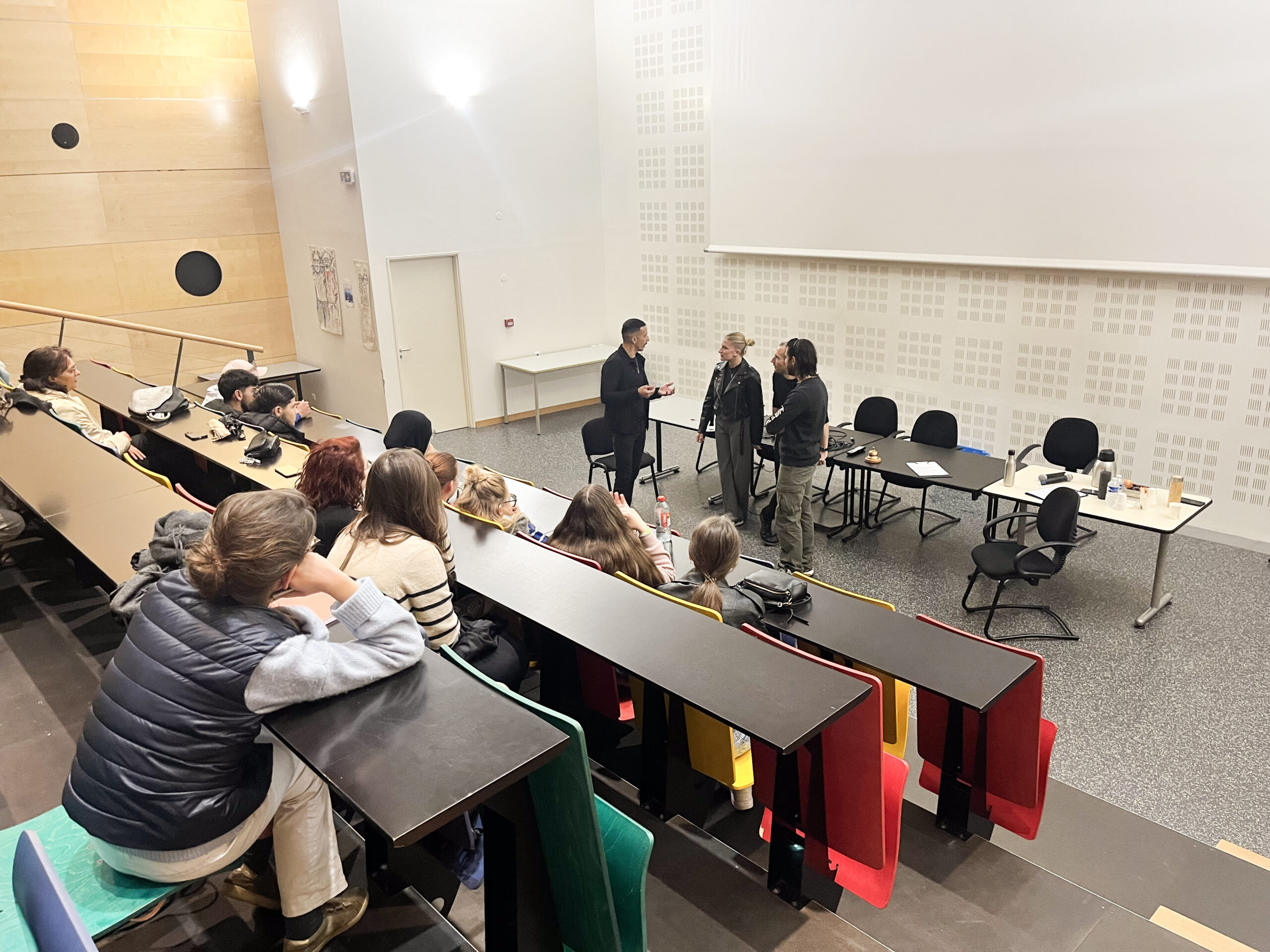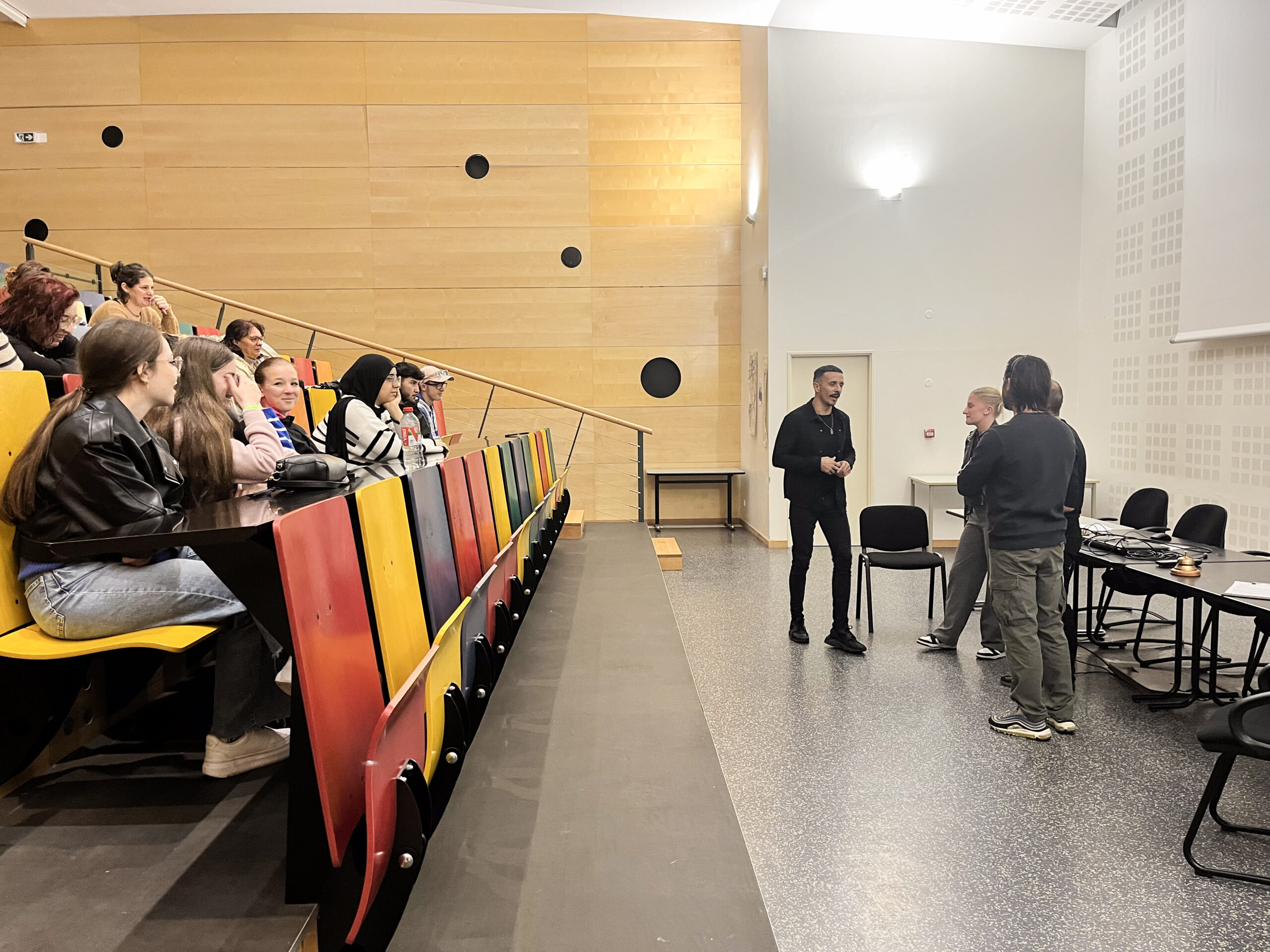 Après l’exposition, les élèves ont assisté à une représentation de théâtre d’improvisation donnée par deux comédiens de la Compagnie Tilt de Nancy, Julien Jouannic et François Barthelemy. À travers plusieurs saynètes, ils ont mis en scène les stéréotypes actuels dans le milieu professionnel, tout en impliquant les élèves dans les improvisations.
