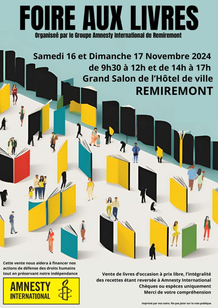 Amnesty International organise une foire aux livres d’occasion ce week-end au grand salon de l’Hôtel de Ville à Remiremont. De 9 h 30 à 12 h et de 14 h à 17 h, cette vente à prix libre permet à l’association de financer ses actions de défense des droits humains en préservant son indépendance.