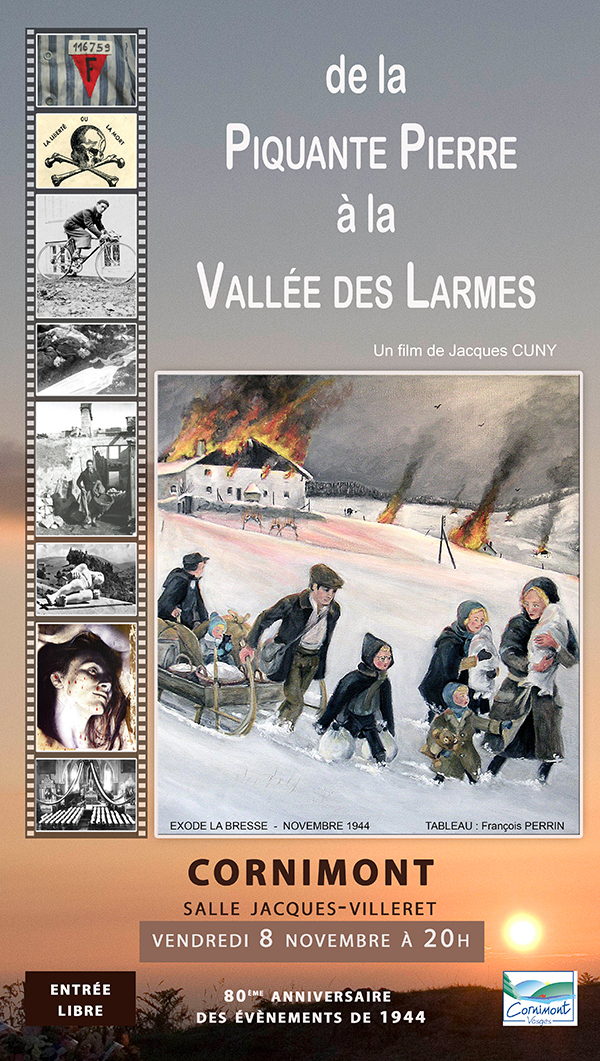 A l’invitation de la mairie de Cornimont, en écho au 80ème anniversaire des évènements de 1944, Jacques Cuny présentera son film « de la Piquante Pierre à la vallée des larmes » à la salle Jacques-Villeret de CORNIMONT le vendredi 8 novembre 2024 à 20heures.