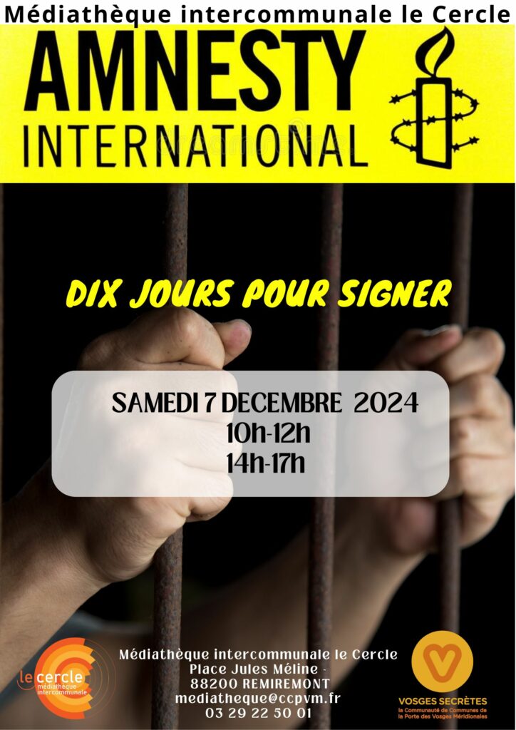 La médiathèque intercommunale le Cercle accueille le groupe romarimontain d’Amnesty International pour l’opération « Dix jours pour signer » en faveur de la défense des droits de l’homme.