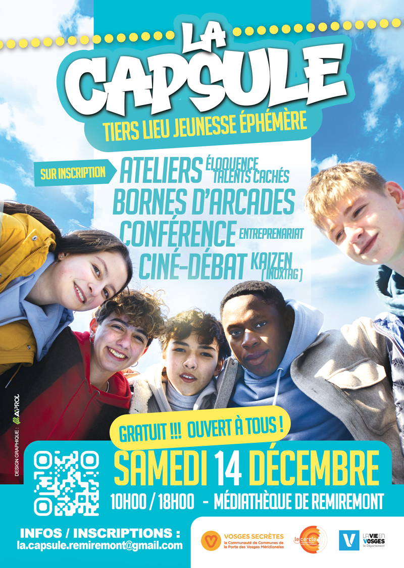 LANCEMENT DE LA CAPSULE : UN TIERS-LIEU DÉDIÉ AUX JEUNES À REMIREMONT Samedi 14 décembre 2024 – de 10h00 à 18h00 – Médiathèque de Remiremont