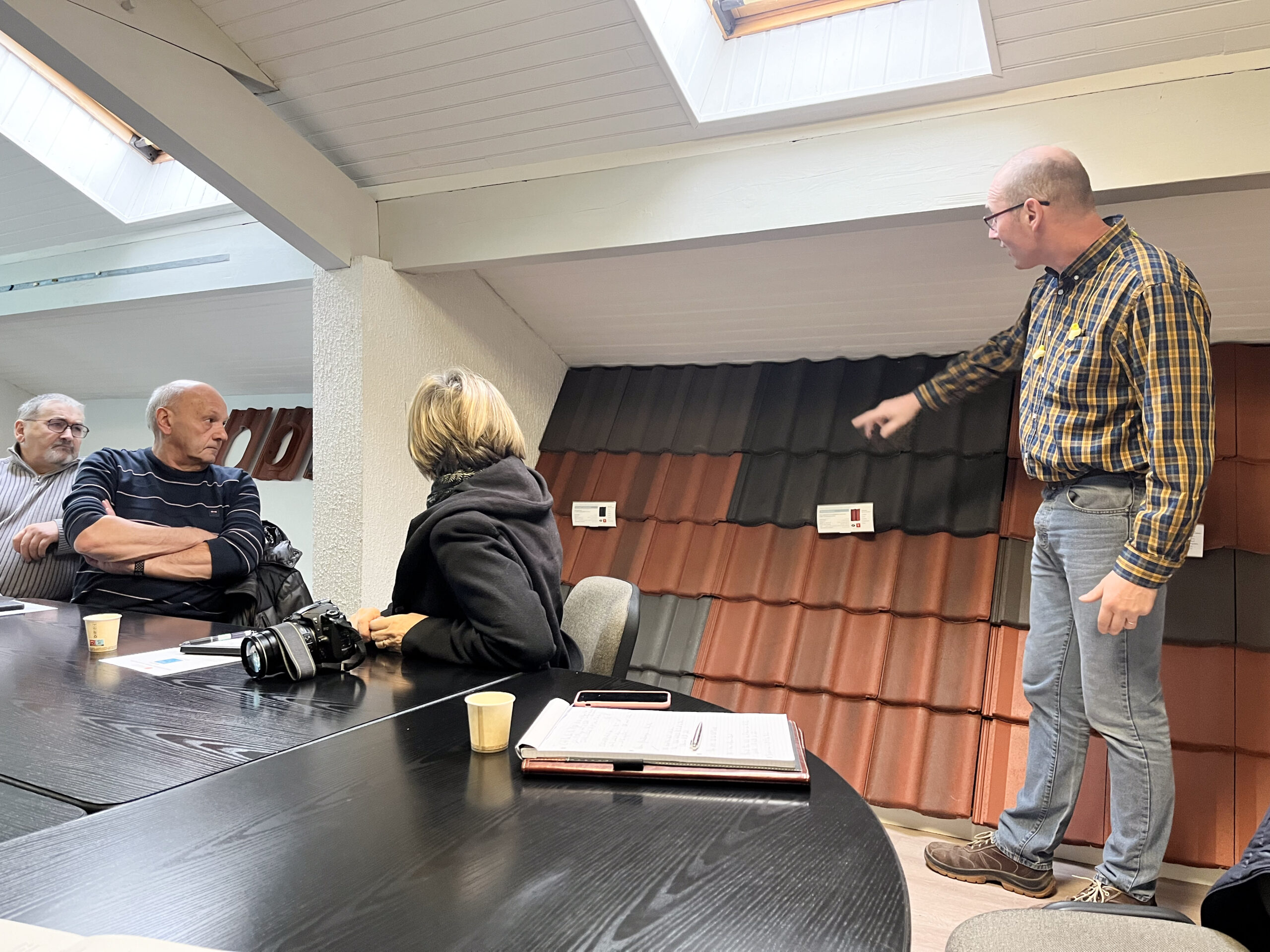 Le directeur a également expliqué le processus de production d’une tuile en béton, composée de 70 % de sable provenant du Tholy, 9 % d’eau recyclée, 1 % de pigment pour la durabilité, et 20 % de ciment. Les tuiles sont moulées en aluminium, puis étuvées entre 6 et 12 heures à une température de 55°C, garantissant une résistance optimale aux intempéries. Patrick Gehin a précisé que les tuiles en béton ne gèlent pas, résistent aux événements climatiques, et qu’elles ne sont pas plus lourdes que les tuiles en terre cuite.