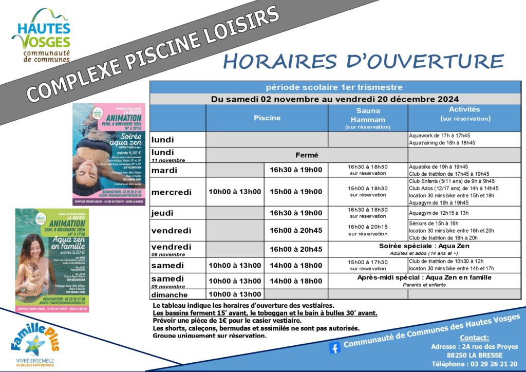 Veuillez trouver ci-joint les horaires de la piscine pour la suite du 1er trimestre 2024
