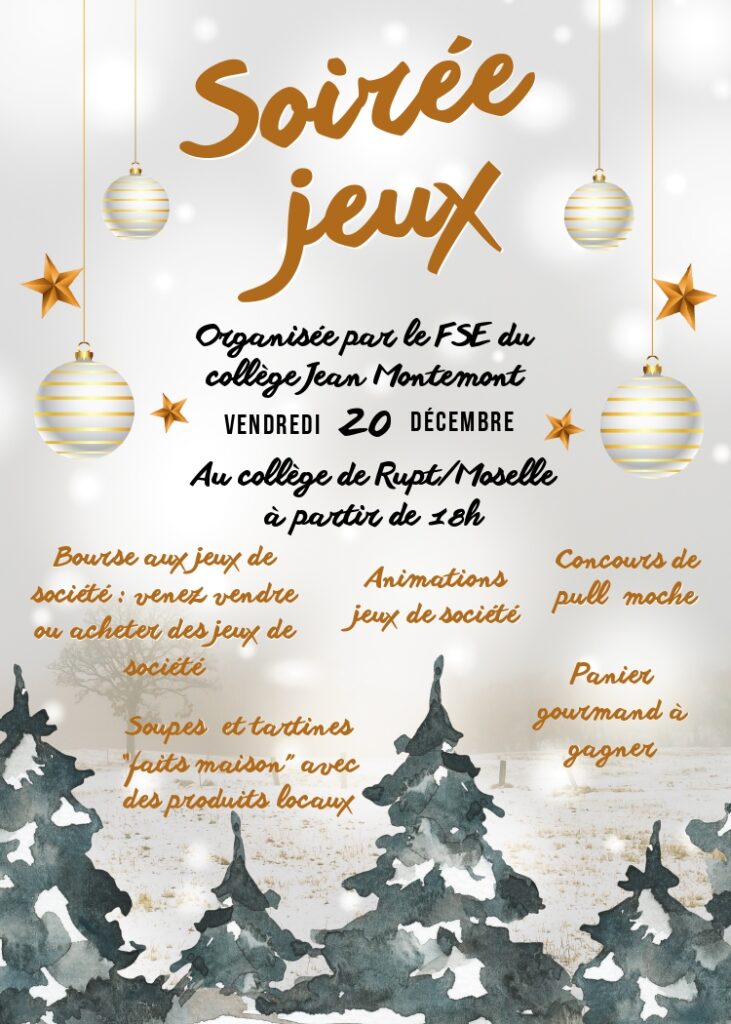 Nous avons le plaisir de vous inviter à une soirée de jeux de société conviviale, qui se déroulera le vendredi 20 décembre 2024, de 18h00 à 22h00, au Collège de Rupt-sur-Moselle.