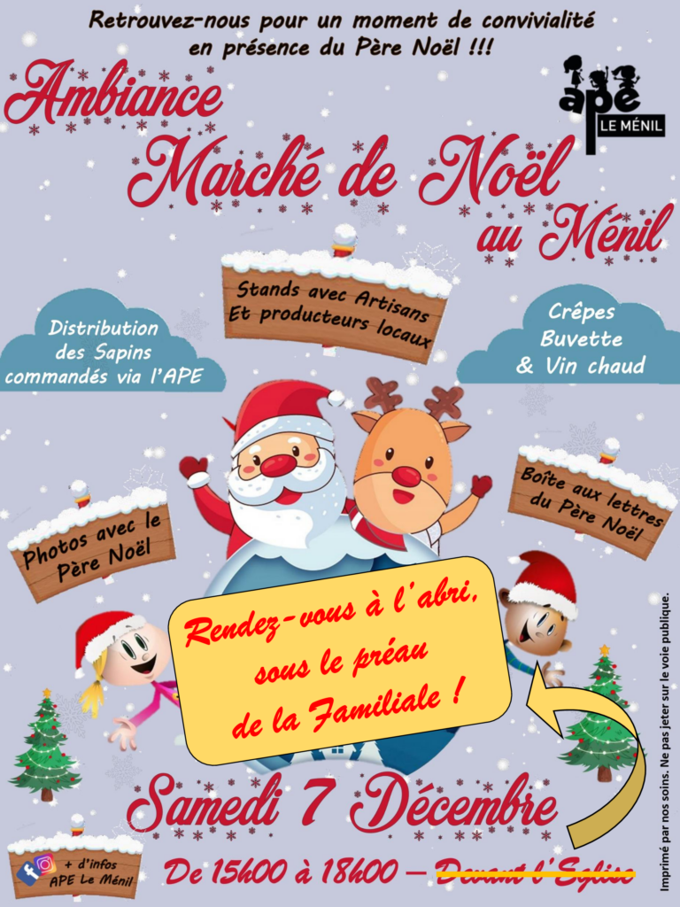 [ANIMATION AMBIANCE MARCHE DE NOEL]le samedi 07/12 de 15 h 00 à 18 h 00 À LA FAMILIALEOn change le lieu, mais on ne change pas d’ambiance !Au vu des conditions annoncées, on se retrouve sous le préau de la Familiale pour passer un bon moment !Au programme et à l’abri :– La distribution des sapins vendus par l’APE