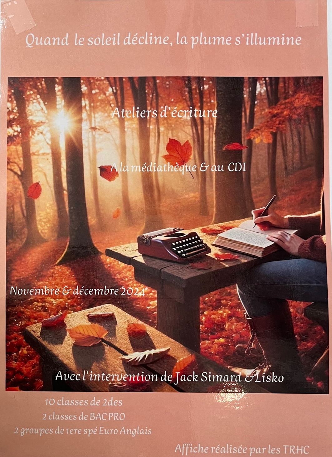 Ce ne sont pas moins de 12 ateliers d’écriture que le CDI du lycée accueille durant les mois de novembre et décembre pour l’ensemble des 10 classes de secondes, des 1ʳᵉ professionnelles et des 1ʳᵉ euro anglais ; et 2 ateliers à la médiathèque de Remiremont afin de mieux faire connaître la structure culturelle locale aux élèves. Ces ateliers sont réalisés par deux artistes régionaux cette année : Jack Simard, chanteur de pop en activité depuis 2011, et « Lisko », alias Lionel Courchinoux, artiste nancéen ayant sorti son premier single courant 2022.Si Jack Simard est déjà coutumier du fait (il a donné un concert au lycée en juin 2022 et réalise des ateliers d’écriture au CDI depuis 3 ans), c’était la première fois que Lisko intervenait au lycée.