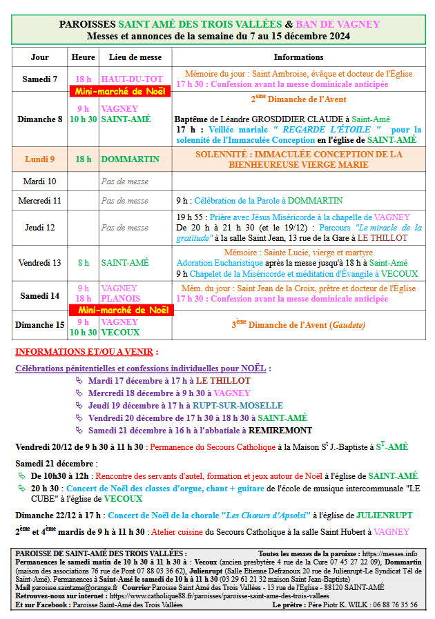 Messes et annonces de la semaine du 7 au 15 décembre