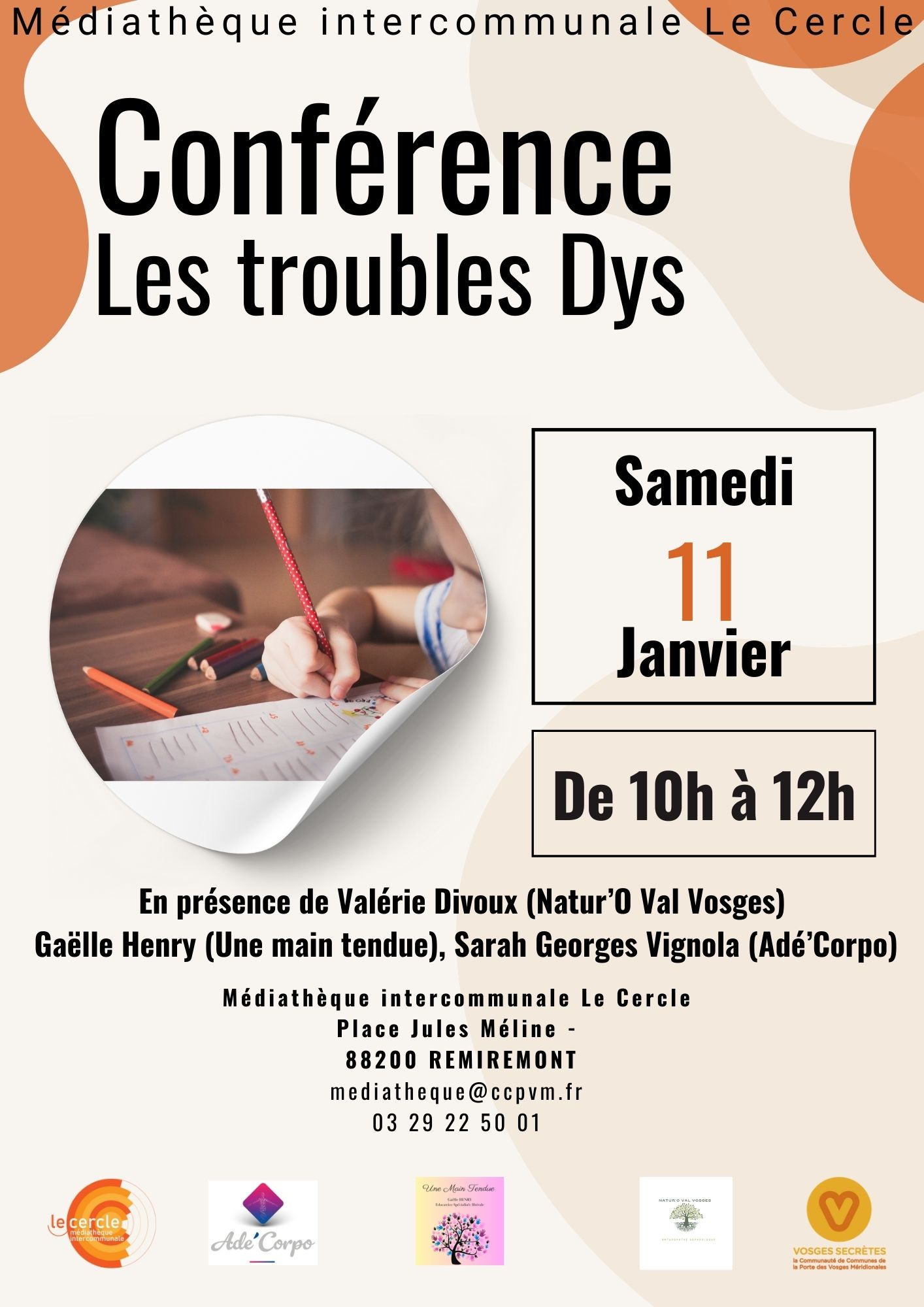 La médiathèque organise en partenariat avec Natur’O Val Vosges, Une main tendue et Adé Corpo un cycle de trois conférences sur le thème des TDAH et des troubles Dys. Cette seconde rencontre abordera les troubles Dys (identification et définition des différents troubles, conséquences sur les sphères sociales pour les enfants et les adultes, intérêt d’une approche globale).