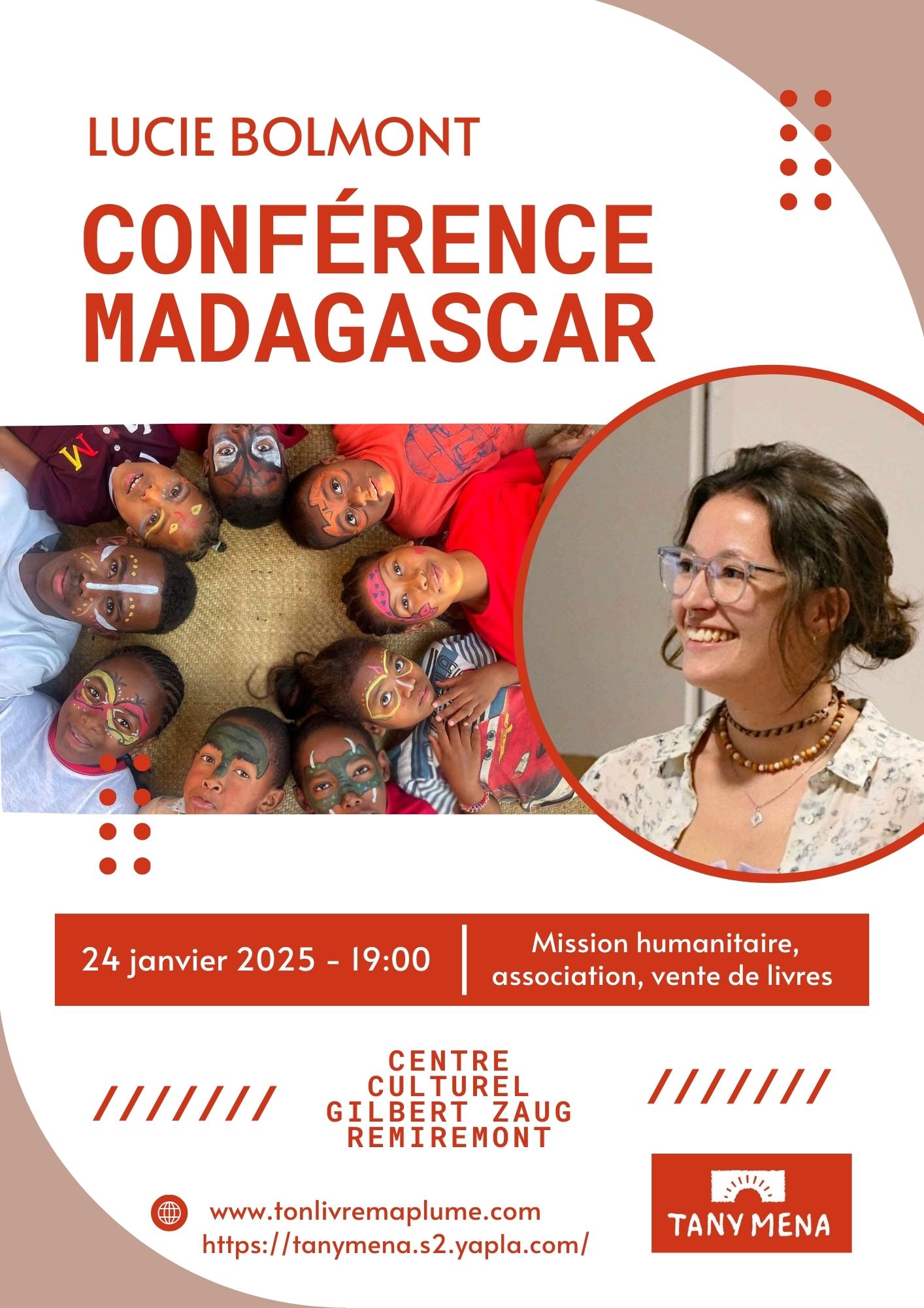 Le 24 janvier à 19h, rendez-vous au centre culturel Gilbert Zaug de Remiremont pour une conférence sur la mission humanitaire à Madagascar que Lucie a menée. Au programme : présentation de son projet de service civique, comprenant trois mois passés dans un orphelinat avec des cours et animations donnés dans une école. Elle parlera également de la culture malgache et de la beauté du pays, toutes deux abordées dans son livre Madagascar, une aventure humanitaire (Éditions Maïa). Dans un dernier temps, elle vous présentera l’association Tany Mena. En somme, un moment d’échange et de partage pour découvrir un ailleurs et se retrouver ensemble.