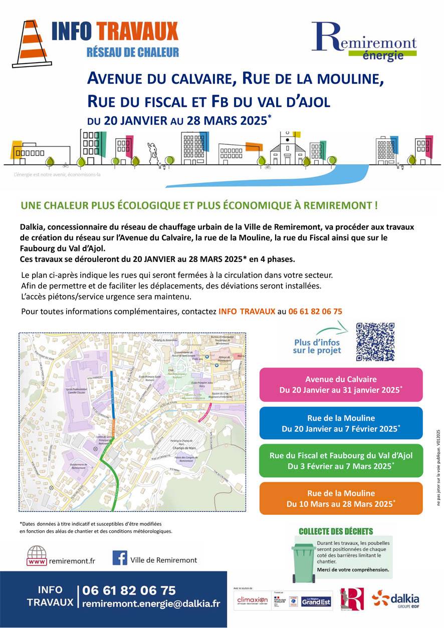 Dans la continuité des travaux d’installation du réseau de chaleur urbaine de Remiremont, l’avenue du Calvaire, la rue du Fiscal, la rue de la Mouline et le faubourg du Val d’Ajol seront en travaux du 20 janvier au 28 mars. Des déviations pourront être mises en place. L’accès piéton aux propriétés riveraines et aux services d’urgences sera maintenu. Les travaux se dérouleront en 4 phases à retrouver ci-dessous :