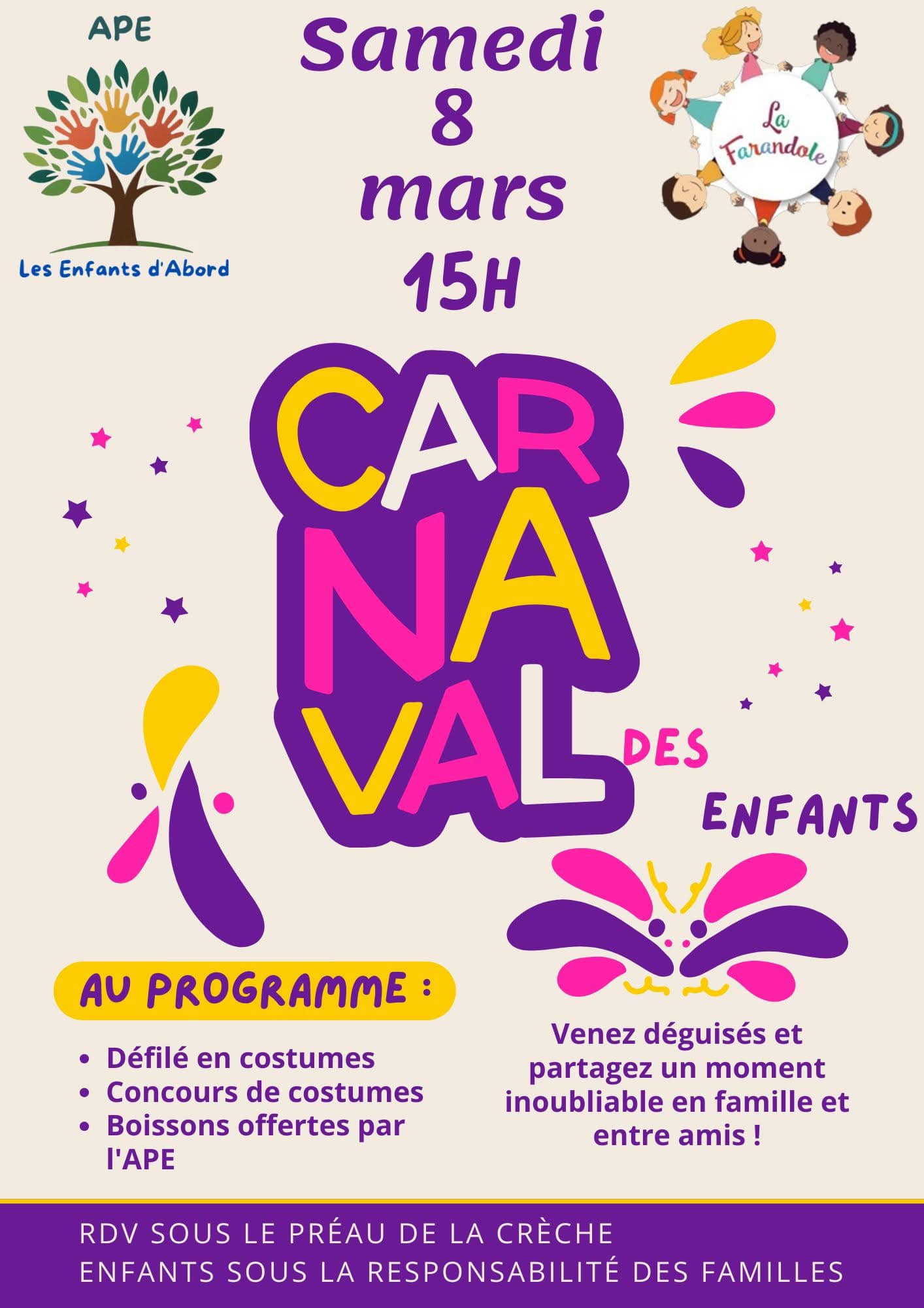 Le Carnaval 2025 organisé par La Farandole et l’APE Les Enfants d’abord aura lieu le samedi 8 mars à 15 h à Saint-Maurice-sur-Moselle. Au programme : défilé costumé, concours de costume et boissons offertes par l’APE. Le rendez-vous est donné sous le préau de la crèche.