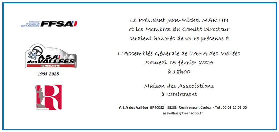 L’ASA des vallées organise son assemblée générale le samedi 15 février à la maison des associations de Remiremont, à 18 h. Une remise de prix est également organisée lors de cet évènement.