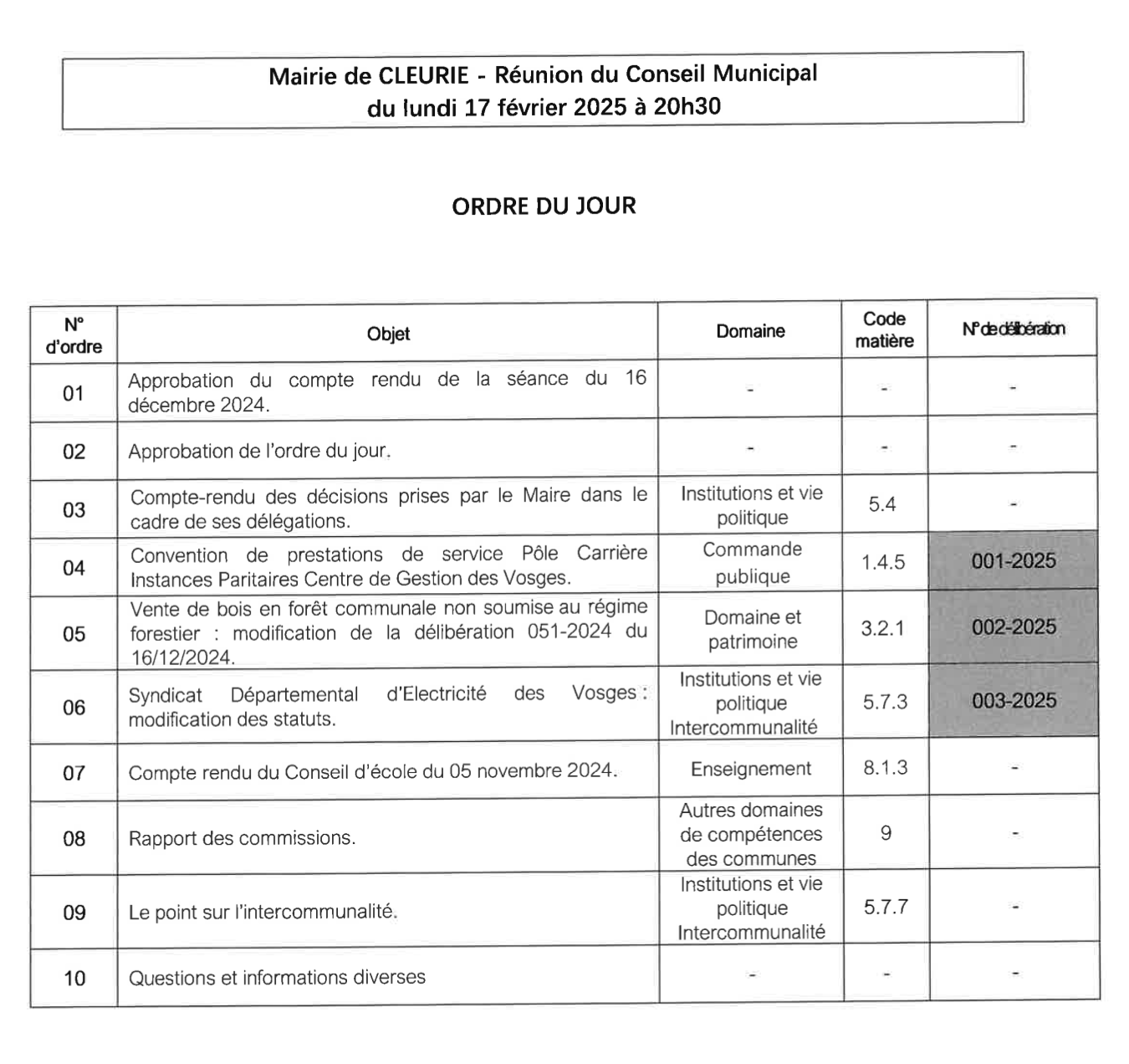 ]]>Mairie de CLEURIE – Réunion du Conseil Municipal du lundi 16 décembre 2024 à 20h30