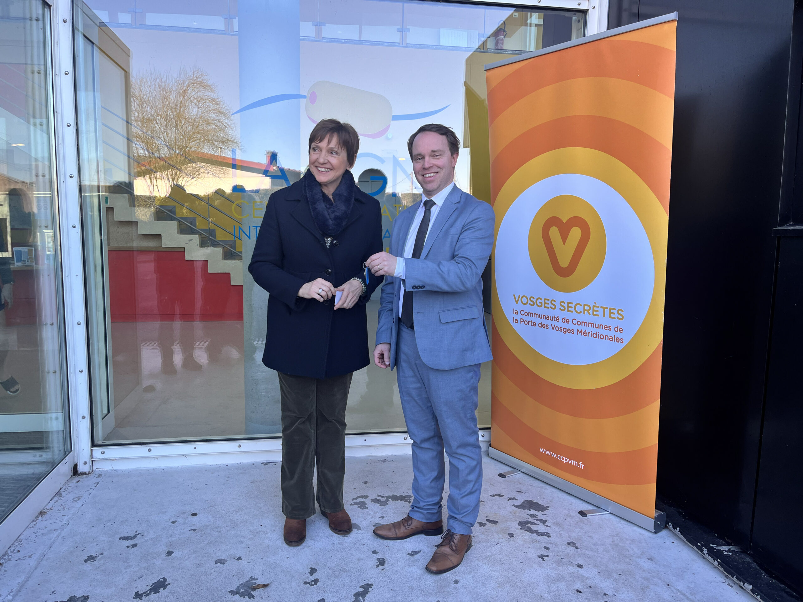 Catherine Louis, présidente de la CCPVM, et Jean-Benoit Tisserand, maire de Remiremont, lors de la passation des clés du centre aquatique.