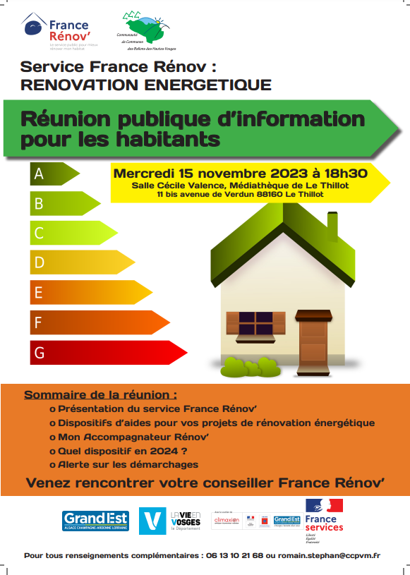 Le Service France Rénov’ existe depuis juillet 2022 au sein de la Communauté de Communes des Ballons des Hautes Vosges. Un conseiller dédié est disponible pour les habitants du territoire, par téléphone majoritairement mais également lors d’une permanence physique qui a lieu le troisième vendredi du mois à la Maison France Services de Le Thillot – 79 avenue de Verdun. Il a pour mission d’informer, de conseiller et d’accompagner les porteurs de projet de rénovation dans leurs démarches.