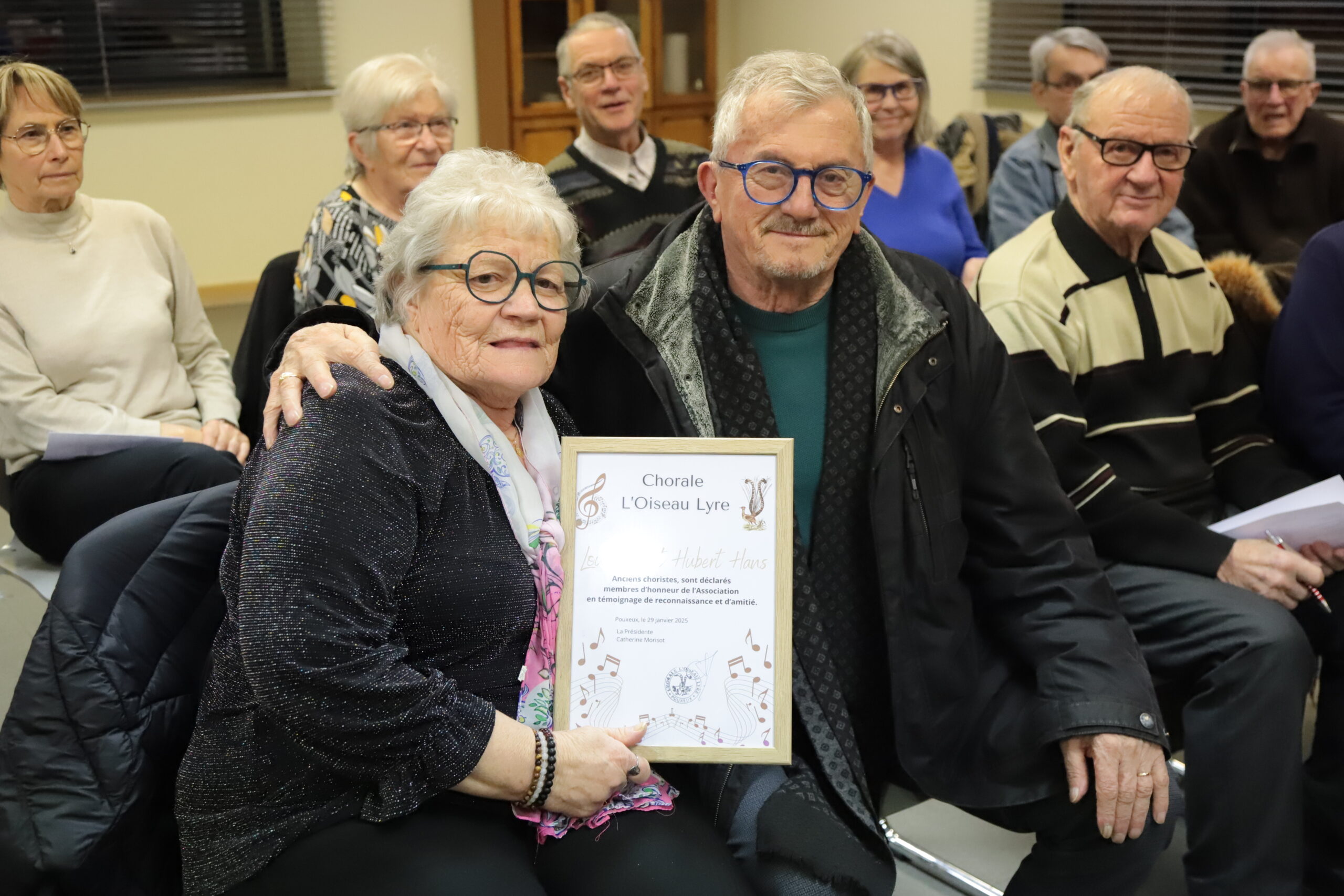 Avant que l’ensemble des participants ne se retrouve autour du verre de l’amitié et partage la galette des rois, le bureau a tenu à saluer l’engagement de trois choristes (Louisette, Hubert et Jean) qui quittent la chorale mais resteront en soutien dans l’association, par la remise du titre de membre d’honneur.