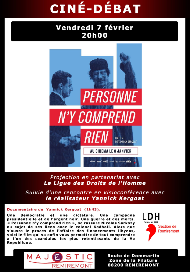Le film/documentaire « Personne n’y comprend rien », présenté hier soir, vendredi 7 février, au cinéma Le Majestic de Remiremont en partenariat avec la section de Remiremont et Vallées de la Ligue des Droits de l’Homme a justement permis aux 80 personnes présentes dans la salle de s’y retrouver dans le dédale de cette affaire actuellement traitée par le tribunal de Paris (procès de l’affaire des financements libyens), également appelée « affaire Sarkozy/Kadhafi ».