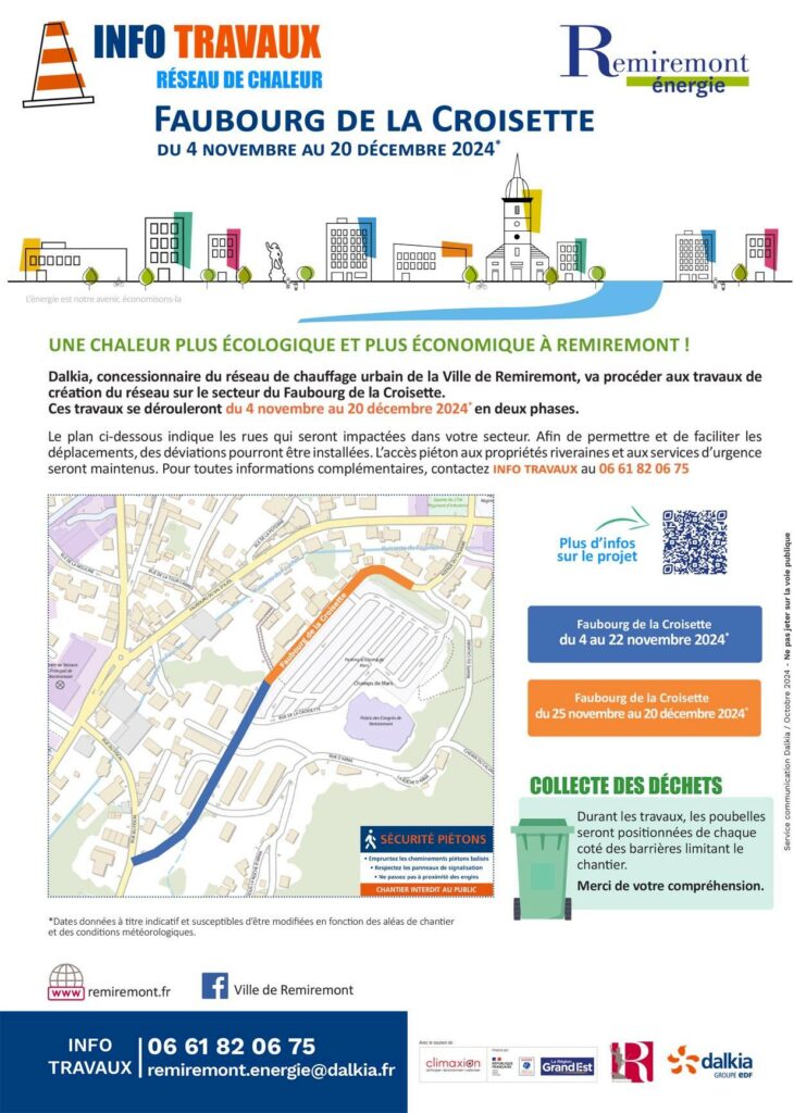 Du 4 au 20 décembre 2024, le Faubourg de La Croisette à Remiremont sera en travaux dans le cadre de la création du réseau de chaleur urbaine par l’entreprise Dalkia. Des déviations pourront être mises en place sur toute la durée des travaux qui se dérouleront en deux phases. Retrouvez le détail de ces phases ci-dessous :