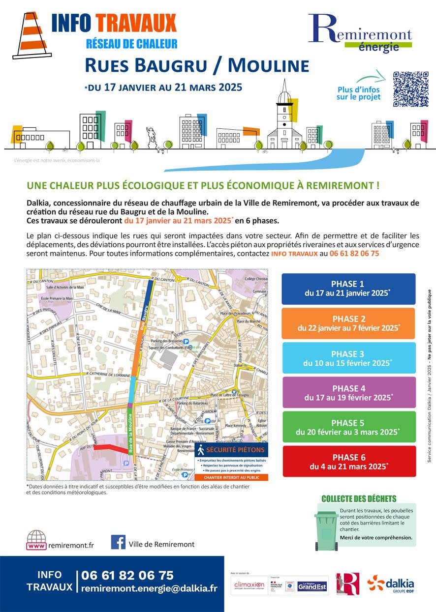 ]]>Dans la continuité des travaux d’installation du réseau de chaleur urbaine de Remiremont, les rues Baugru et Mouline seront en travaux du 17 janvier au 21 mars. Des déviations pourront être mises en place. L’accès piéton aux propriétés riveraines et aux services d’urgences sera maintenu. Les travaux se dérouleront en 6 phases à retrouver ci-dessous :