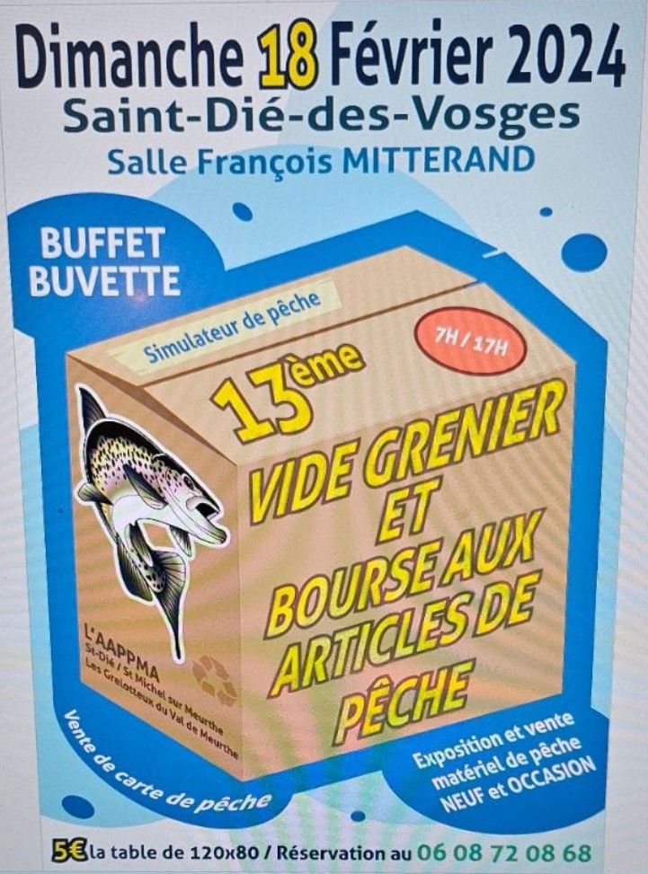 L’AAPPMA de Saint-Dié-des-Vosges et Saint-Michel-sur-Meurthe organise, avec les Grelotteux du Val-de-Meurthe, la 13e édition du vide-greniers et bourse aux articles de pêche de Saint-Dié-des-Vosges, qui se tiendra de 7h à 17h ce dimanche 18 février à l’Espace François-Mitterrand.