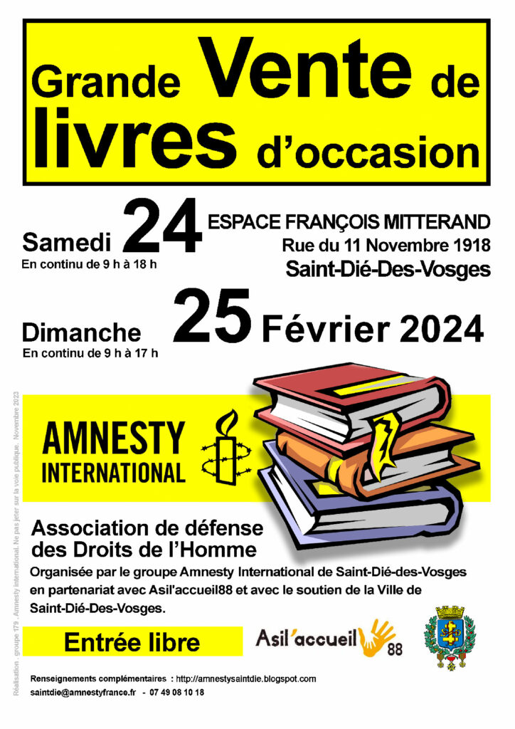 De 9h à 18h samedi puis de 9h à 17h le lendemain dimanche, ce sont des milliers de livres divers et variés qui seront à retrouver dans les allées de l’Espace François-Mitterrand. Organisée en partenariat avec Asil’Accueil 88, et avec le soutien de la Ville de Saint-Dié-des-Vosges, la vente permettra de récolter de l’argent pour financer « des actions de promotion et de défense des droits humains en toute indépendance. » Sur place, des pétitions-papier seront disponibles « pour défendre des cas emblématiques de violations de droits humains. »
