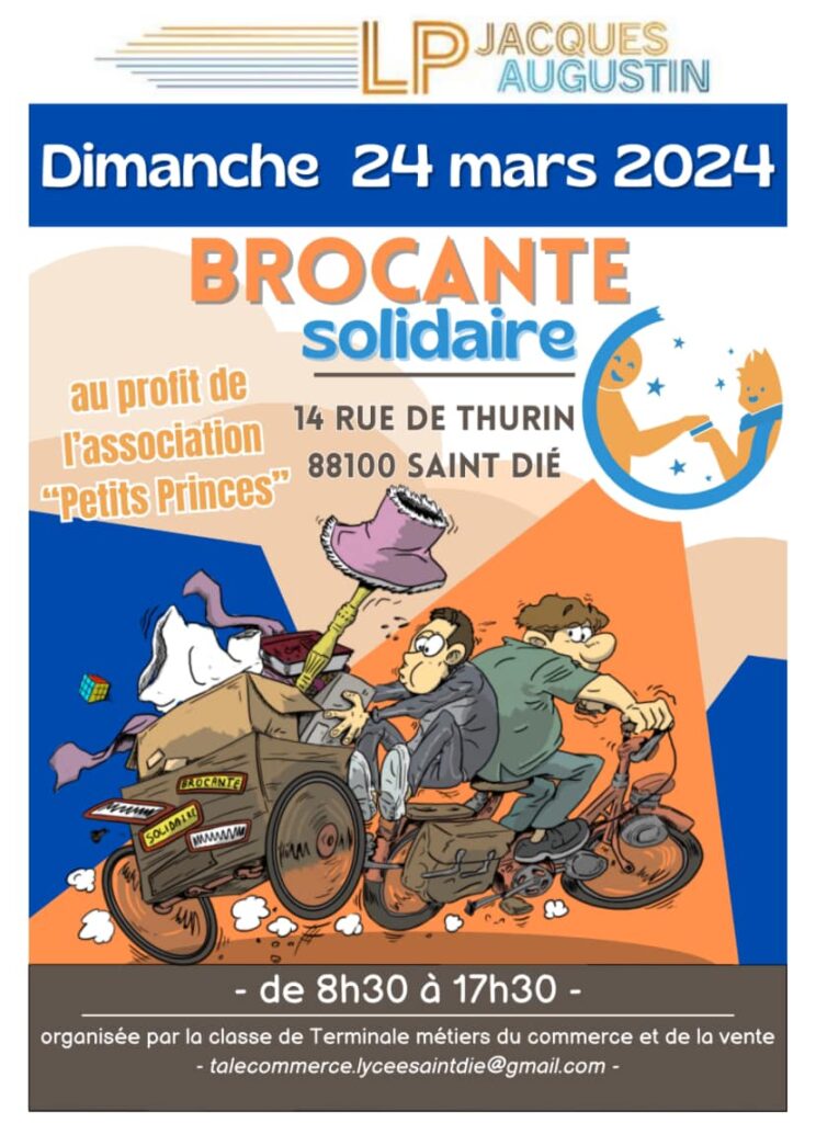 Le dimanche 24 mars prochain, de 8h30 à 17h30, les élèves de la classe de Terminale Métiers du Commerce et de la Vente du lycée Jean-Baptiste Jacques-Augustin organisent une brocante solidaire au 14, rue de Thurin. Solidaire, car cette brocante est au profit de l’association « Petits Princes », qui oeuvre à réaliser les rêves d’enfants et d’adolescents malades. Plus de renseignements sur la brocante via talecommerce.lyceesaintdie@gmail.com.