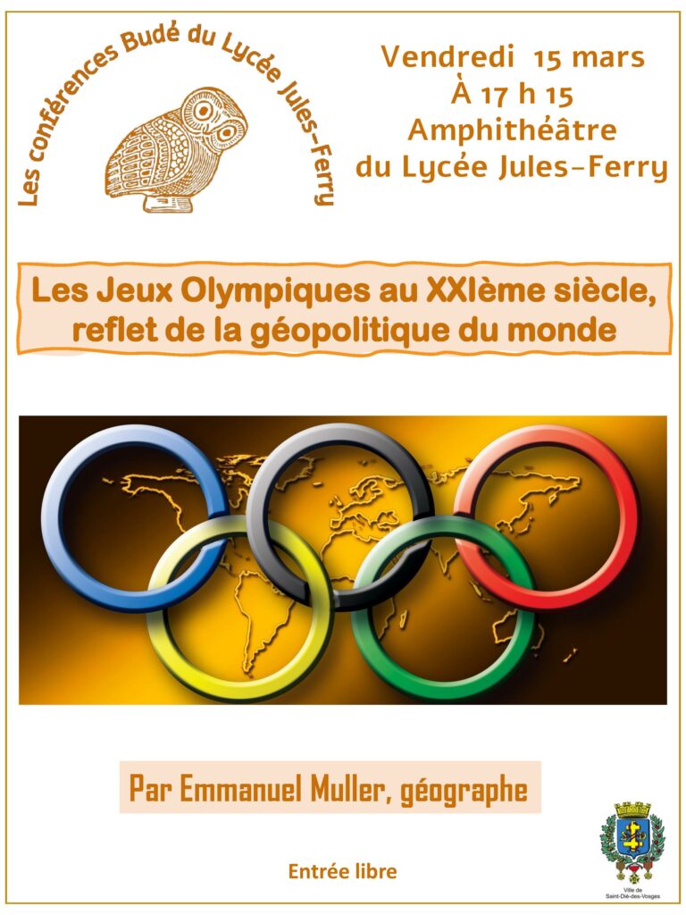 La prochaine conférence Budé se tiendra le vendredi 15 mars, à partir de 17h15 à l’amphithéâtre de la Cité Scolaire Jules-Ferry. Intitulée « Les Jeux Olympiques au XXIe siècle, reflet de la géopolitique du monde », la conférence sera animée par Emmanuel Muller, géographe. Entrée libre. Pour toute informations complémentaire : association.bude88@gmail.com.