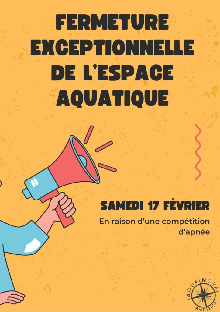 En raison de la 7e coupe Americ’Apnée, l’espace aquatique du centre AquaNova America sera exceptionnellement fermé, toute la journée, ce samedi 17 février.