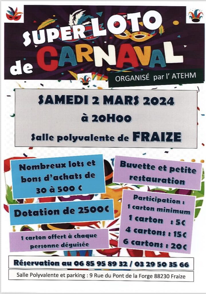 L’ATEHM organise un super loto de carnaval, qui aura lieu ce samedi 2 mars à partir de 20h à la salle polyvalente de Fraize. Toutes les informations pratiques sont à retrouver ci-dessous.