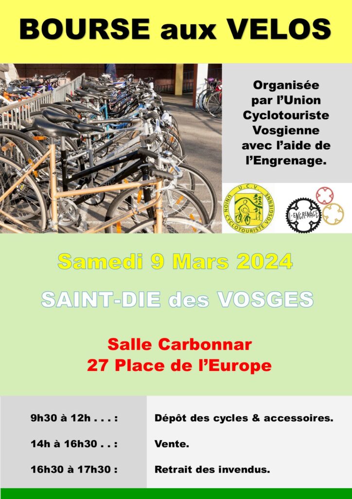 La bourse aux vélos annuelle de l’Union Cyclotouriste Vosgienne – UCV – sera de retour le samedi 9 mars prochain à Saint-Dié-des-Vosges. Pour cette édition 2024, 2 nouveautés sont à souligner : la bourse se déroulera à la salle Carbonnar, et non plus au Palais Omnisports Joseph-Claudel, et l’Engrenage assurera le contrôle des cycles. Informations complémentaires ci-dessous.