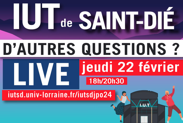 Pour celles et ceux qui n’auraient pas pu se rendre aux portes-ouvertes de l’IUT de Saint-Dié-des-Vosges, qui se sont tenues le samedi 10 février dernier, les différentes formations de l’établissement supérieur déodatien seront présentées en direct sur YouTube, ce jeudi 22 février à partir de 18h sur le compte YouTube de l’IUT.