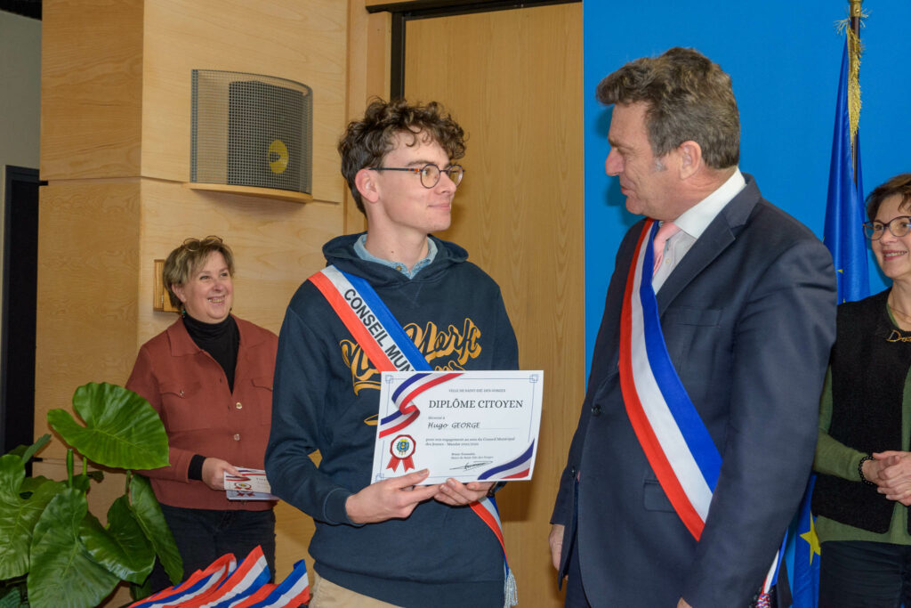 Ce samedi en fin de matinée, c’est également au Grand Salon que le maire Bruno Toussaint procédé à la traditionnelle remise des écharpes tricolores aux 20 jeunes nouveaux élus déodatiens, qui débutent ainsi leur mandat de 2 années. Ils rejoignent les 19 conseillers « redoublants », qui ont reçu ce matin leurs diplômes de citoyens. Ce qui porte le CMJ déodatien à 39 membres. Lors de la cérémonie de remise, Bruno Toussaint a réaffirmé la nécessité pour un élu du CMJ d’assister aux différentes fêtes patriotiques, notamment celles du 8 mai, du 14 juillet et du 11 novembre. Le CMJ participe également aux différents temps forts de la ville, comme Un jardin dans ma ville. Mais avant cela, les 39 jeunes élus se retrouveront à la MFR de Saint-Dié-des-Vosges, en haut du col de Saales, pour un week-end d’intégration les 24 et 25 février prochains.