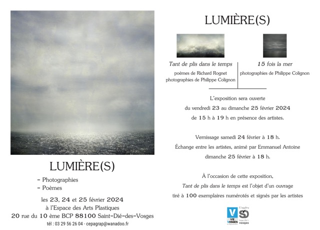 Les vendredi 23, samedi 24 et dimanche 25 février prochains, le photographe Philippe Colignon et le poète Richard Rognet présenteront l’exposition éphémère « Lumière(s) » au CEPAGRAP. Entrée libre. Vernissage samedi à 18h, qui sera suivi le lendemain dimanche par un échange avec les artistes à 18h également.