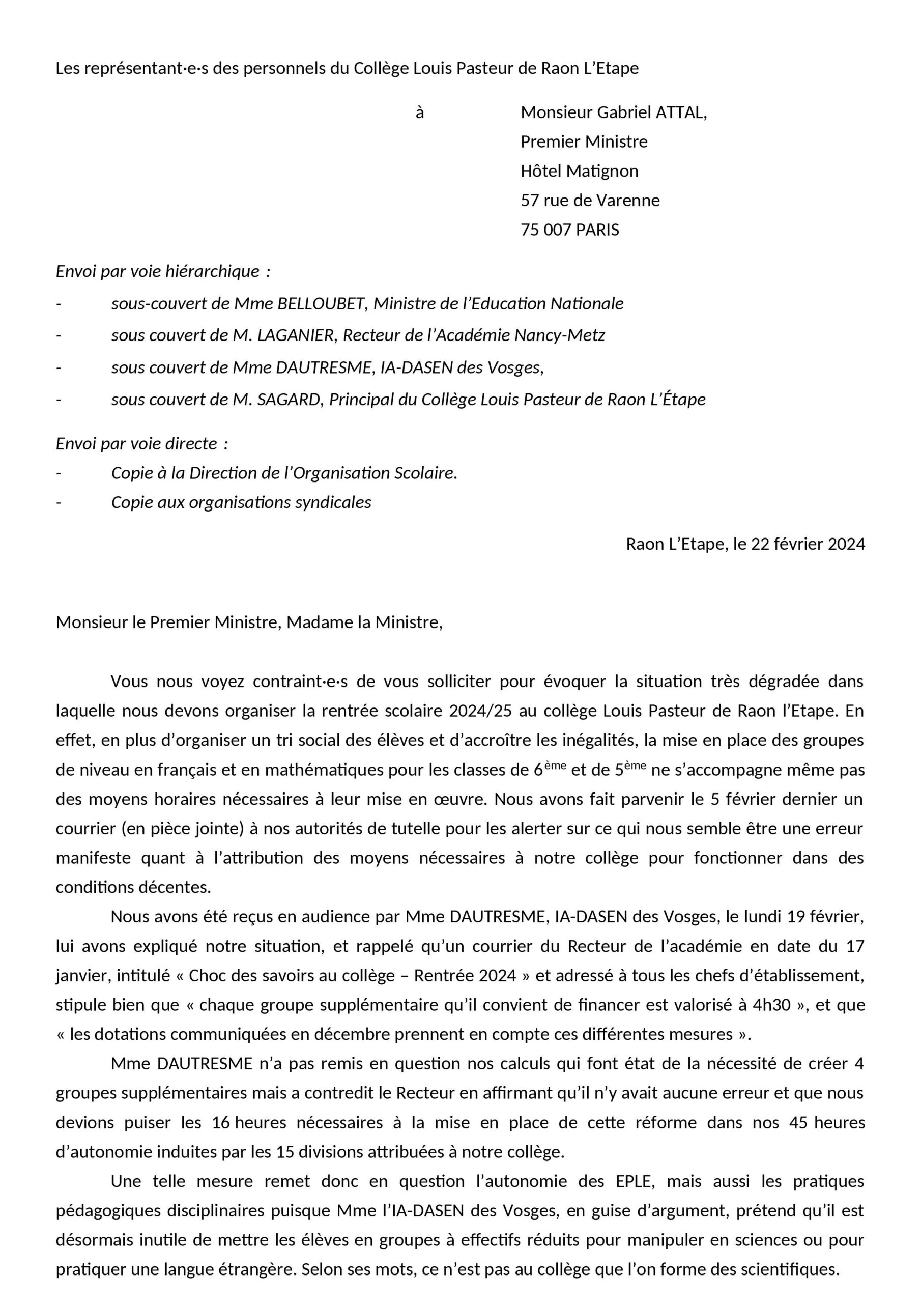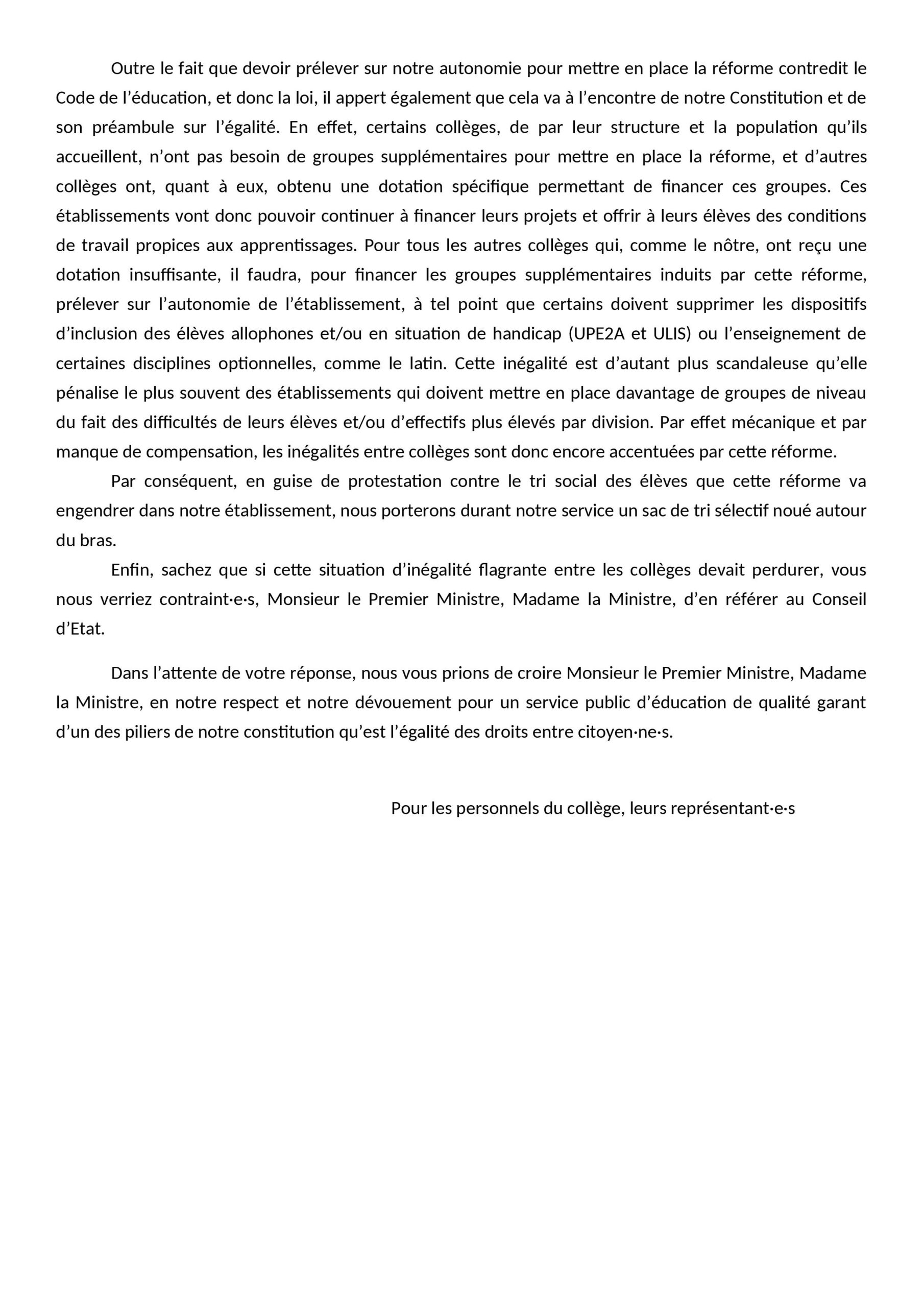 « Cette réforme, en plus de mettre en place un tri social des élèves, n’est même pas financée à hauteur des besoins et se fait au détriment de l’enseignement de disciplines telles que les Sciences ou les Langues Vivantes. » déplorent les représentants du collège Louis-Pasteur, dont voici le courrier adressé jeudi dernier au premier ministre (cliquer pour agrandir le texte) :