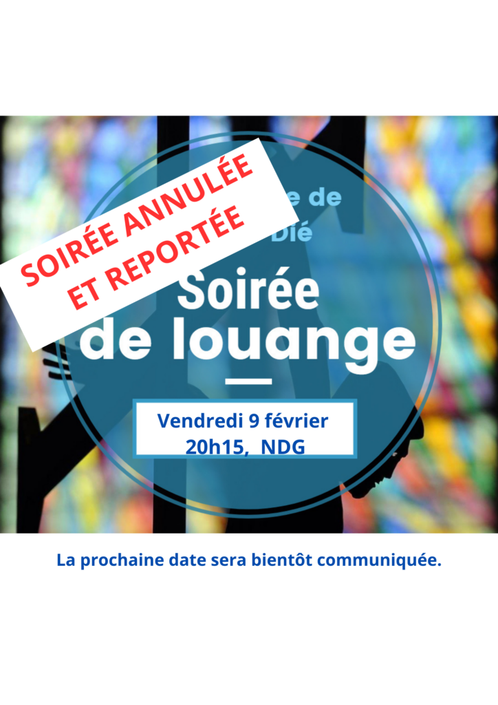 La soirée de louange, qui devait avoir lieu demain vendredi à l’église Notre-Dame de Galilée de Saint-Dié-des-Vosges, est reportée à une date ultérieure.