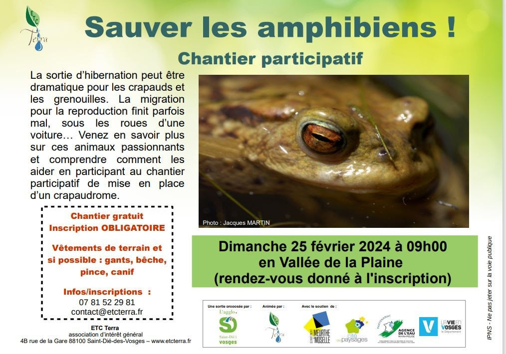 L’association ETC… Terra organise un chantier participatif en Déodatie afin de sauver les amphibiens. Gratuit et ouvert à tous, ce chantier sur inscription se déroulera le dimanche 25 février prochain, à partir de 9h en Vallée de la Plaine. Le lieu exact du rendez-vous sera donné à l’inscription, qui se fait par téléphone, au 07-81-52-29-81, ou via contact@etcterra.fr.