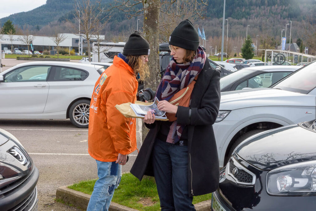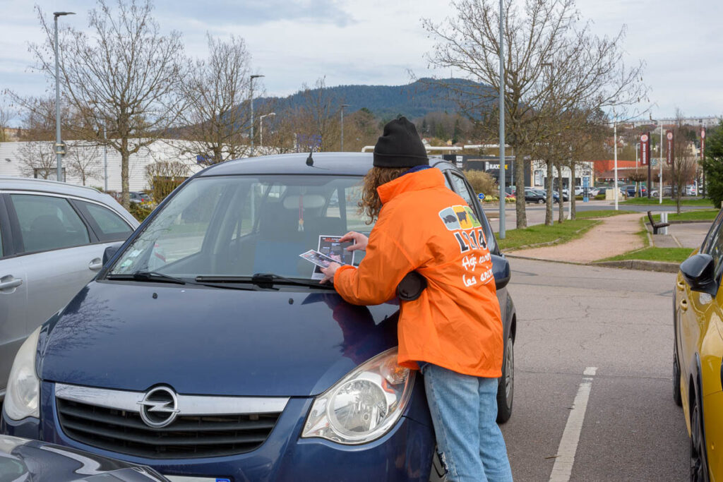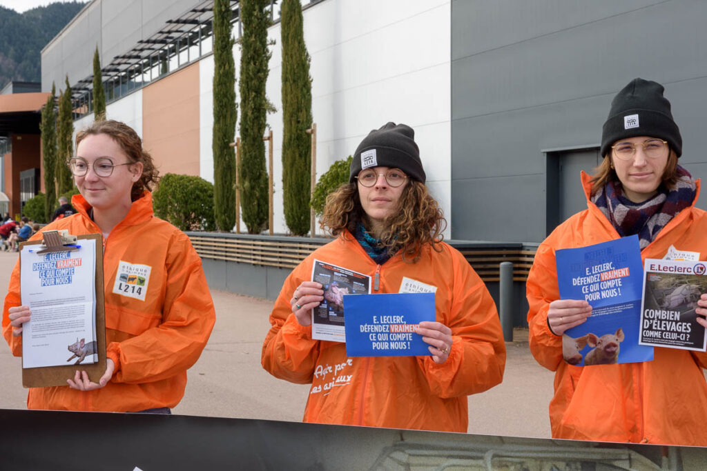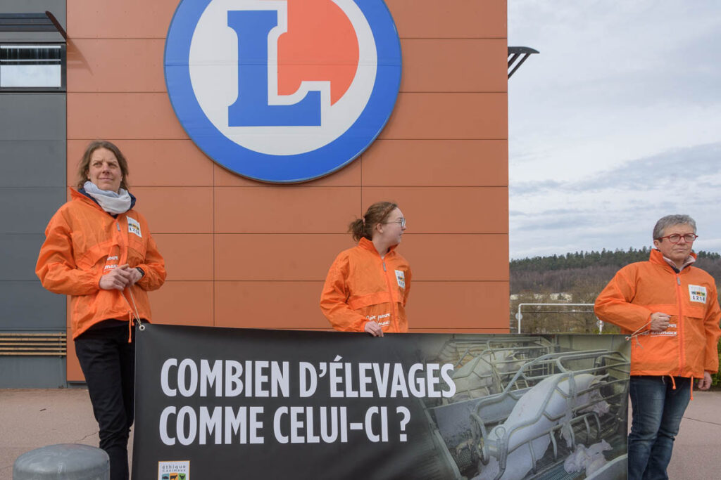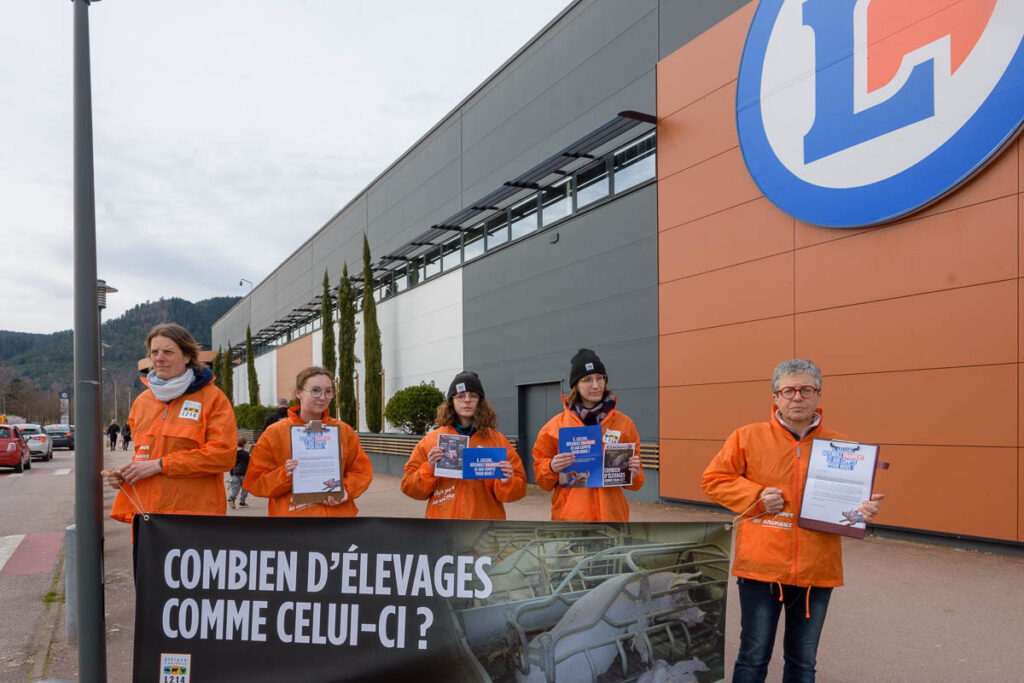 En écho à cette vidéo, des militants de 30 groupes locaux de l’association de défense des animaux se mobilisent aux 4 coins du pays devant des grandes surfaces E.Leclerc, pour informer la clientèle de ces conditions d’élevage. Ce fut notamment le cas à Saint-Dié-des-Vosges, où ce samedi après-midi des militantes de L214 ont brandi une banderole « Combien d’élevages comme celui-ci ? » devant l’hypermarché E.Leclerc de la zone Hellieule 2, tout en distribuant des tracts au public.