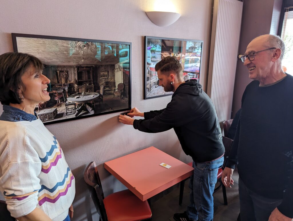 Lambert Pêcheur (au centre) a accroché ce lundi matin ses photographies urbex sur les murs du bar Les Deux Rives.
