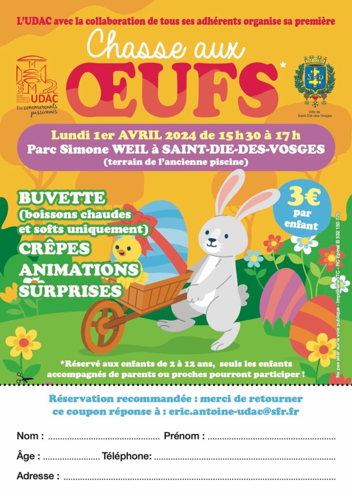 A Saint-Dié-des-Vosges, l’Union Déodatienne des Artisans et Commerçants – UDAC – organise précisément une chasse aux œufs, qui se déroulera de 15h30 à 17h au Jardin Simone-Veil, sur la rive gauche de la Meurthe. Pour cette première édition, l’association a mis les petits plats dans les grands, avec une buvette (boissons chaudes et softs uniquement), des crêpes, des animations… et des surprises ! La chasse aux œufs est réservée aux enfants de 2 à 12 ans, sachant que les bambins devront être accompagnés de parents ou de proches. Le tarif pour participer est de 3€ par enfant, sur réservation en retournant le coupon réponse ci-dessous à eric.antoine-udac@sfr.fr.