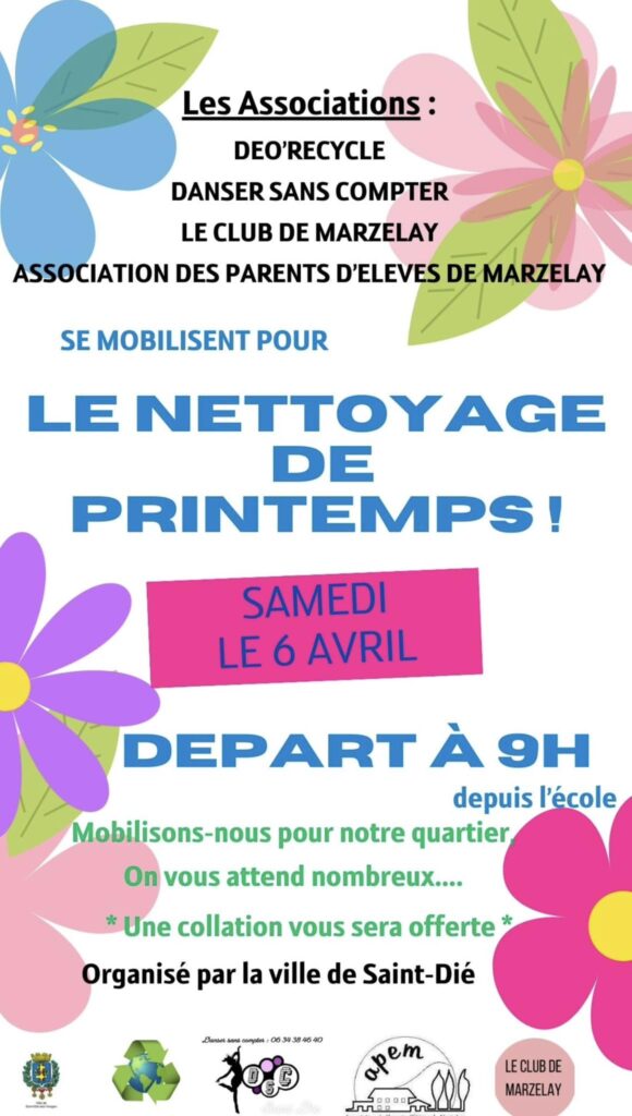 A cette occasion, les associations « Déo’Recycle », « Danser Sans Compter », le Club de Marzelay et l’association des parents d’élèves de Marzelay se retrousseront les manches ensembles pour nettoyer le quartier Marzelay de fond en comble, avec une journée de nettoyage ouverte à tous le samedi 6 avril. Rendez-vous en début de matinée au niveau de l’école de Marzelay, pour un départ à 9h. Une collation sera offerte à tous les participants à cette opération de nettoyage.