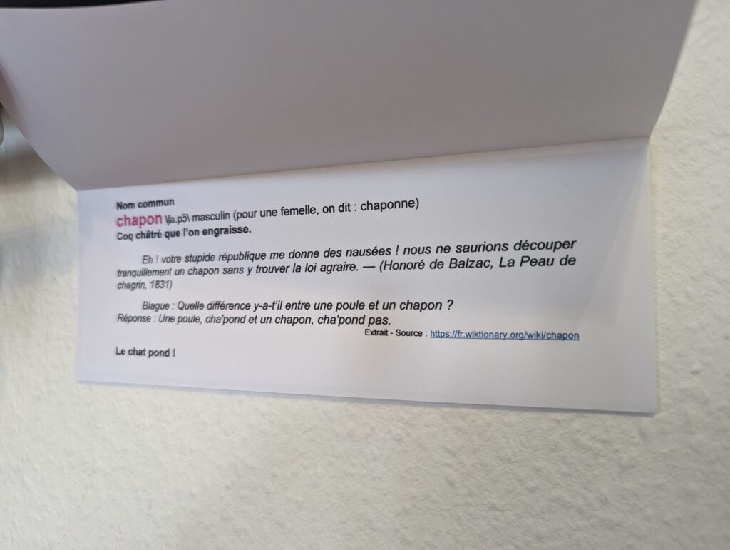 Cette exposition de Patrick Antonot a comme double particularité de présenter des images exclusivement générées par une intelligence artificielle – en l’occurrence celle d’Adobe – et qui représentent exclusivement des chats. Le tout avec bon zeste d’humour, en s’inspirant des chats du dessinateur Siné. Chapon, Chamailler, Charlemagne… les 16 tirages découlant tous d’un jeu de mot basé sur la syllabe « Cha ».