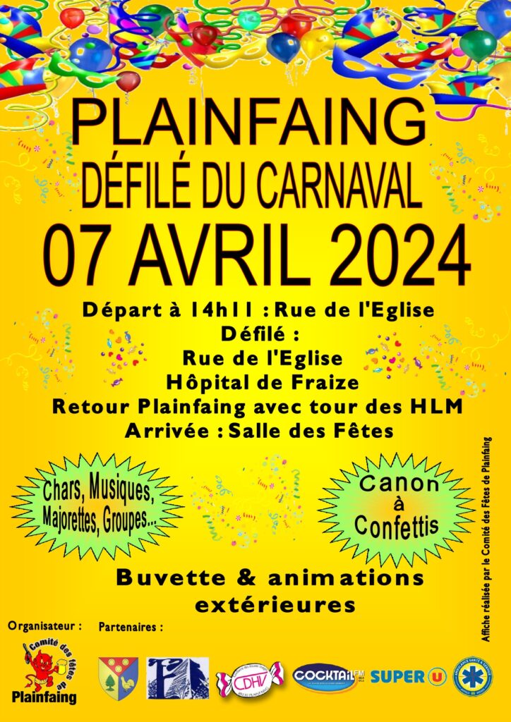 Le défilé de carnaval de Plainfaing, organisé par le Comité des Fêtes, aura lieu le dimanche 7 avril prochain. Départ du cortège à 14h11 au niveau de la rue de l’église, qui se rendra ensuite à l’hôpital de Fraize pour un retour à Plainfaing avec le tour des HLM. L’arrivée du défilé sera à la salle des fêtes plainfinoise. Buvette et animations extérieures.