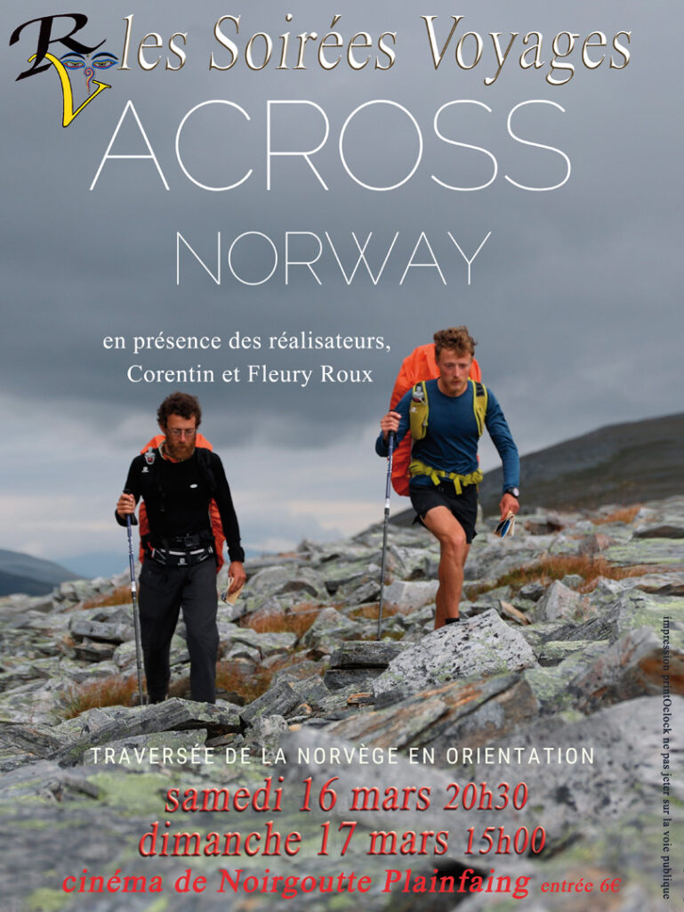 L’association Reportage-Voyage organise une double projection du film « Across Norway », le samedi 16 mars à 20h30 et le dimanche 17 mars à 15h30 au cinéma de Noiregoutte de Plainfaing. Cette double projection se déroulera en présence des réalisateurs, Corentin et Fleury Roux, champions internationaux de course d’orientation. Entrée à 6€ – Gratuit pour les moins de 16 ans.
