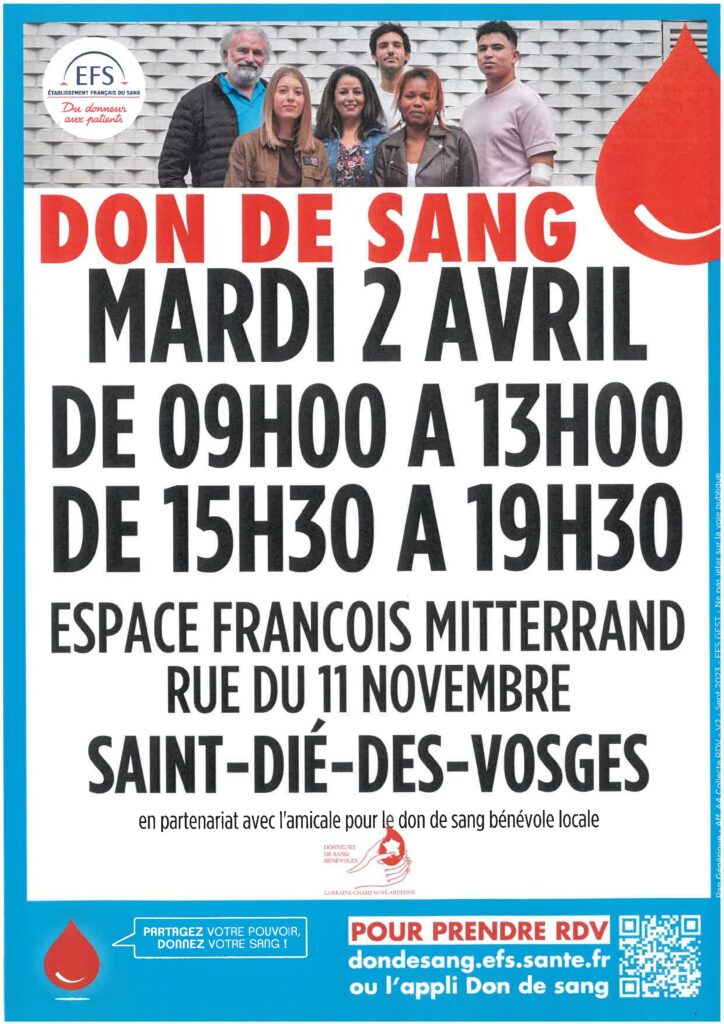 La prochaine collecte de sang organisée à Saint-Dié-des-Vosges par l’Etablissement Français du Sang – EFS – Grand Est, avec le soutien de l’amicale locale des Donneurs de Sang bénévoles, aura lieu le mardi 2 avril, de 9h à 13h puis de 15h30 à 19h30 à l’Espace François-Mitterrand. Pour prendre rendez-vous, facultatif mais conseillé, rendez-vous sur https://dondesang.efs.sante.fr.