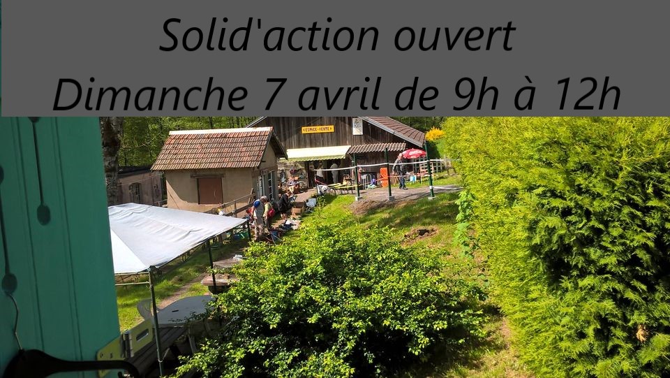 Les locaux de Solid’Action, situés au 38 rue du Charmois à Raon-l’Etape, seront ouverts de 9h à 12h le dimanche 7 avril. Ils sont également ouverts en semaine, du lundi au vendredi, de 13h30 à 17h30.