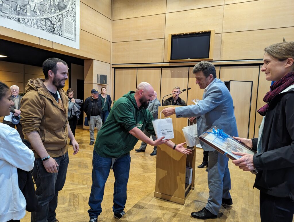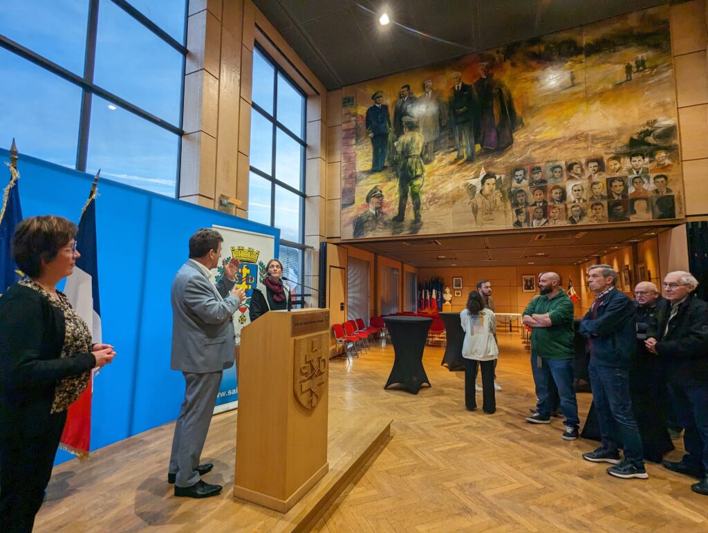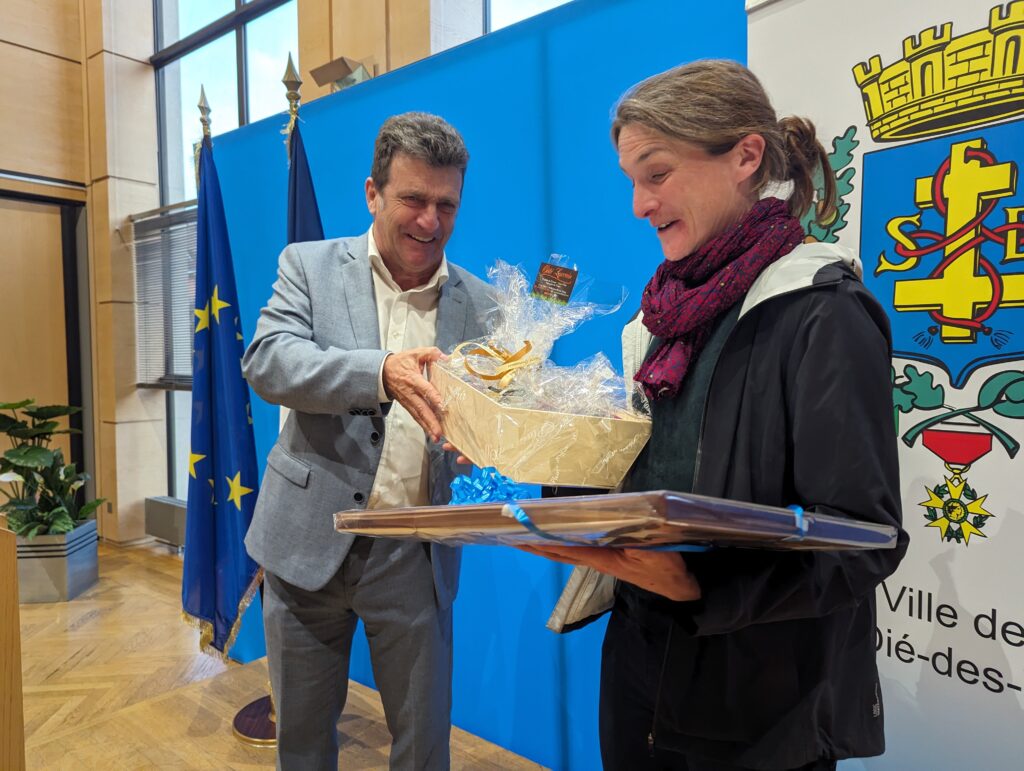 Après un trajet en voiture au départ de Toulon, c’est ce mercredi en fin de journée que la délégation de 8 marins a été accueillie au Grand Salon de l’Hôtel de Ville, par le maire Bruno Toussaint, lors d’une courte cérémonie qui se voulait conviviale. L’occasion de remettre quelques présents locaux au nouveau commandant du bâtiment, le capitaine de frégate Anne Favède, ainsi qu’à ses subordonnés.