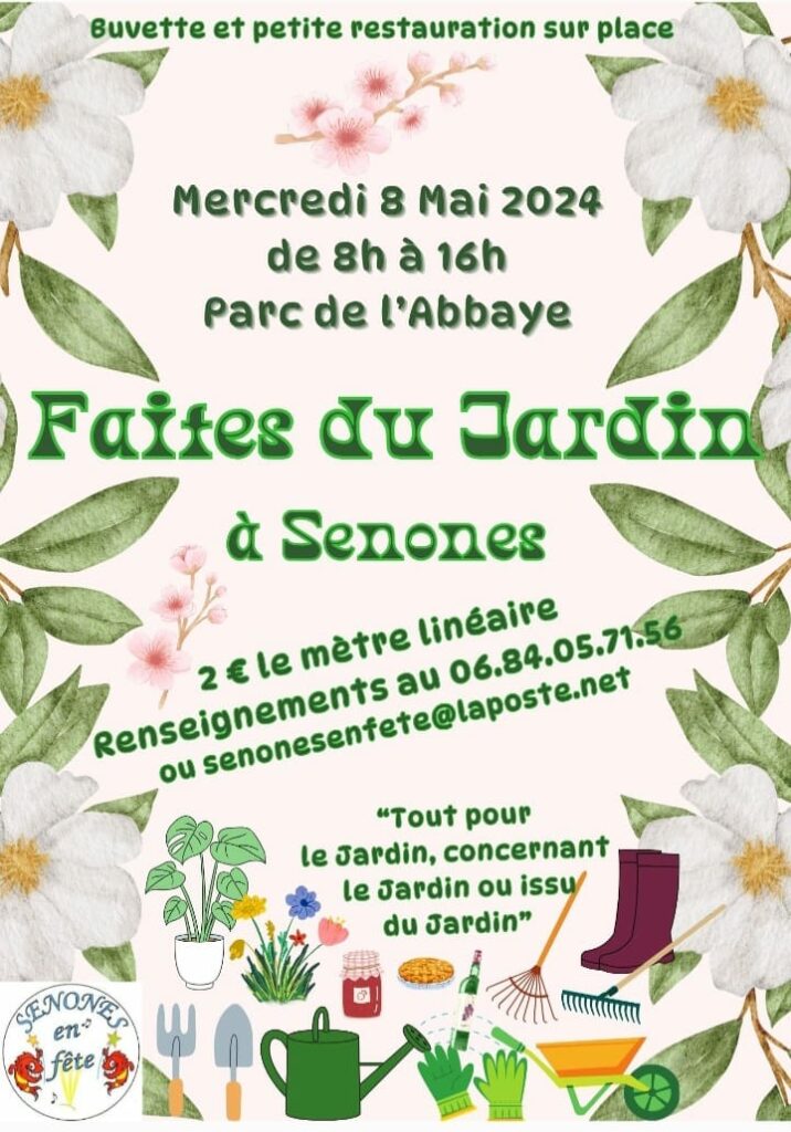 Mercredi 8 mai, le parc de l’abbaye de Senones accueillera, de 8h à 16h, accueillera « Faites du Jardin », ou tout pour le jardin, concernant le jardin ou issu du jardin. Buvette et petite restauration sur place. Le tarif pour les exposants est de 2€ le mètre linéaire. Renseignements auprès de l’association Senones en Fêtes, au 06-84-05-71-56 ou via senonesenfete@laposte.net.