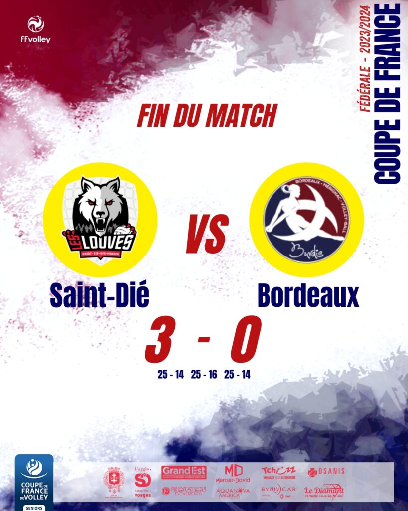 Car c’est Saint-Dié-des-Vosges qui accueillait le « Final Four » de ladite Coupe de France. Etaient en lice aux côtés des Louves les Comètes d’Orléans, Romans-sur-Isère et Les Burdis de Bordeaux-Mérignac. Ces 2 dernières équipes étant également les adversaires des Déodatiennes en play-offs Elite Access.