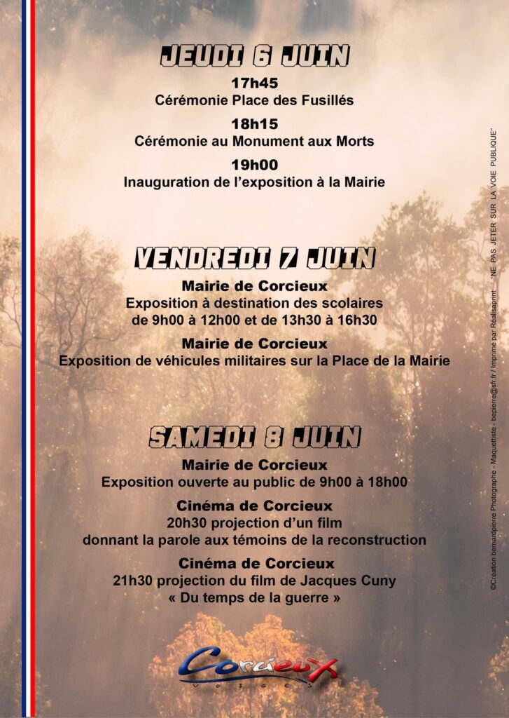 Du jeudi 6 au samedi 8 juin sera célébré le 80e anniversaire des événements du maquis de Corcieux. Cérémonies, expositions et projections de films sont au programme de cet anniversaire, dont le programme détaillé est à retrouver ci-dessous :